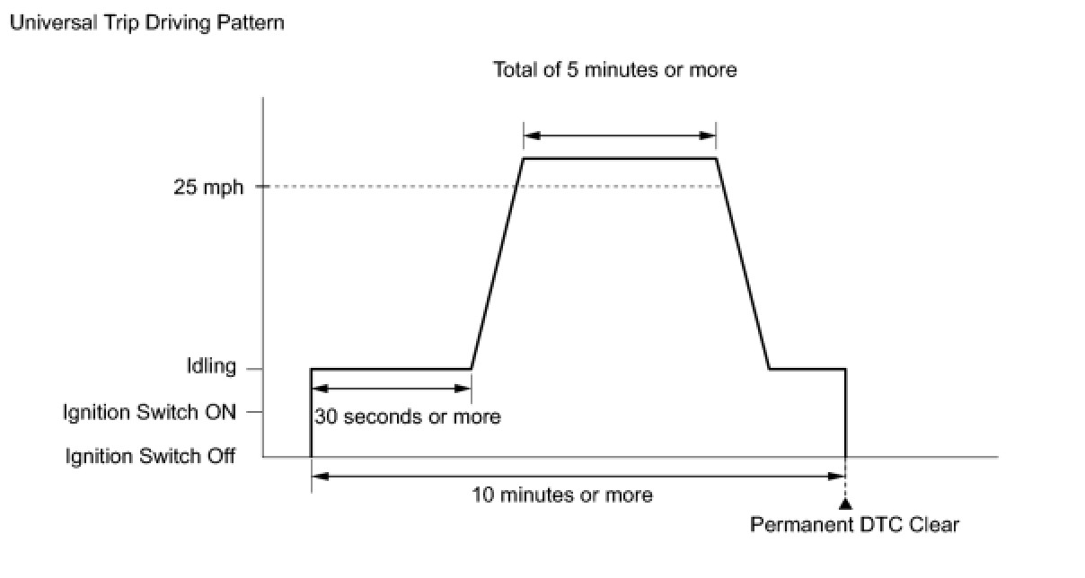 * After clearing current DTCs using the Techstream (or by disconnecting the cable from the negative battery terminal), permanent DTCs can be cleared when the system is determined to be normal for the relevant DTCs and then the universal trip is performed. The driving pattern to obtain a normal judgment is described under the "CONFIRMATION DRIVING PATTERN" for the respective DTC.