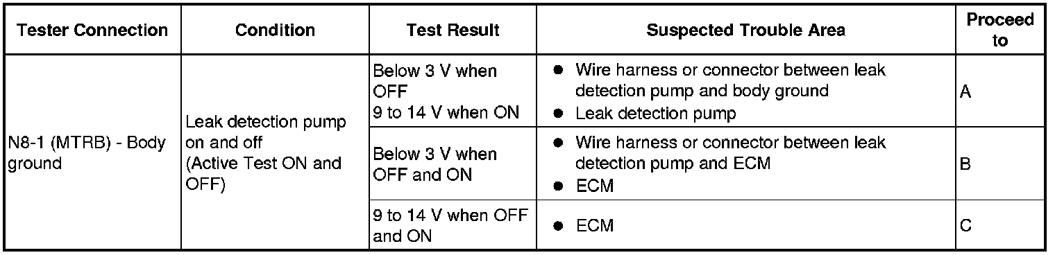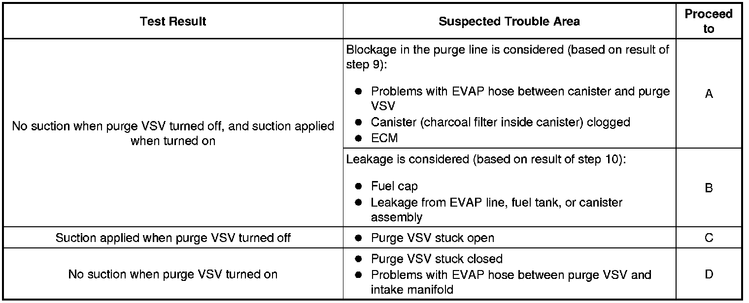 If any EVAP system DTCs are stored, the malfunctioning area can be determined using the table below.