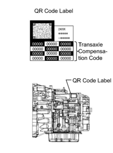 Transaxle compensation codes are unique, 60-digit alphanumeric values printed on a QR label on the transaxle. If an incorrect transaxle compensation code is input into the TCM, shift shock may occur.