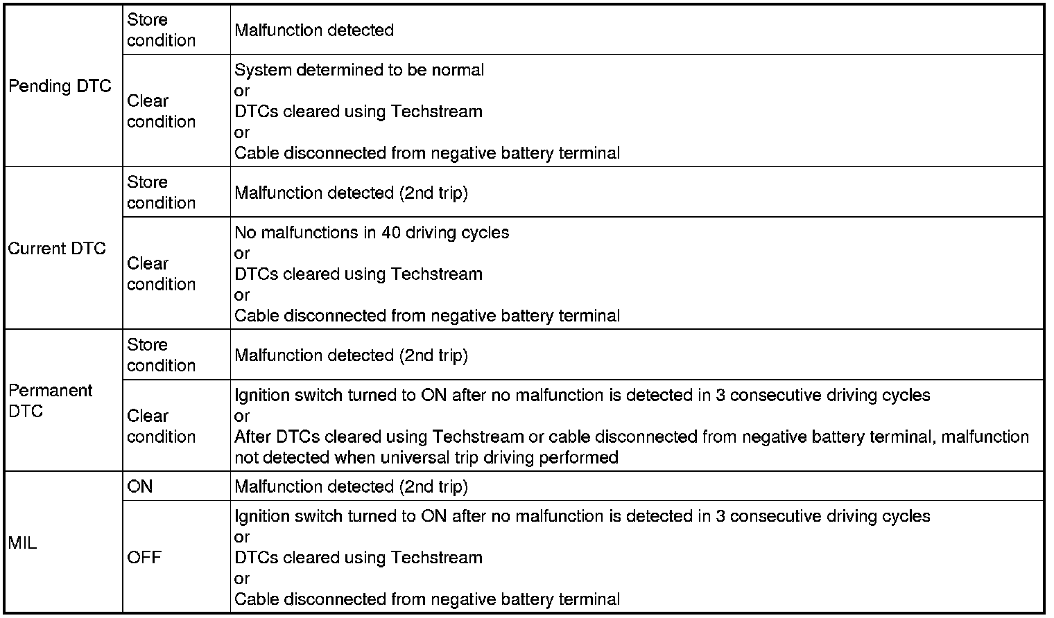 * Current and pending DTCs can be cleared by using the Techstream or by disconnecting the cable from the negative battery terminal. However, permanent DTCs cannot be cleared using either of these two methods.