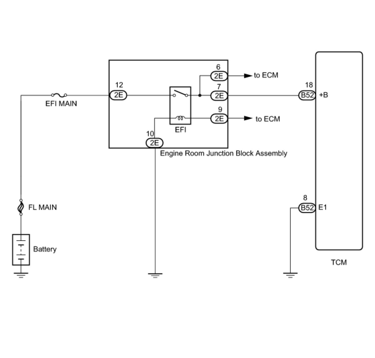 When the ignition switch is turned to ON, voltage from the ECM's MREL terminal is applied to the EFI MAIN relay. This causes the contacts of the EFI MAIN relay to close, which supplies power to terminal +B of the TCM.