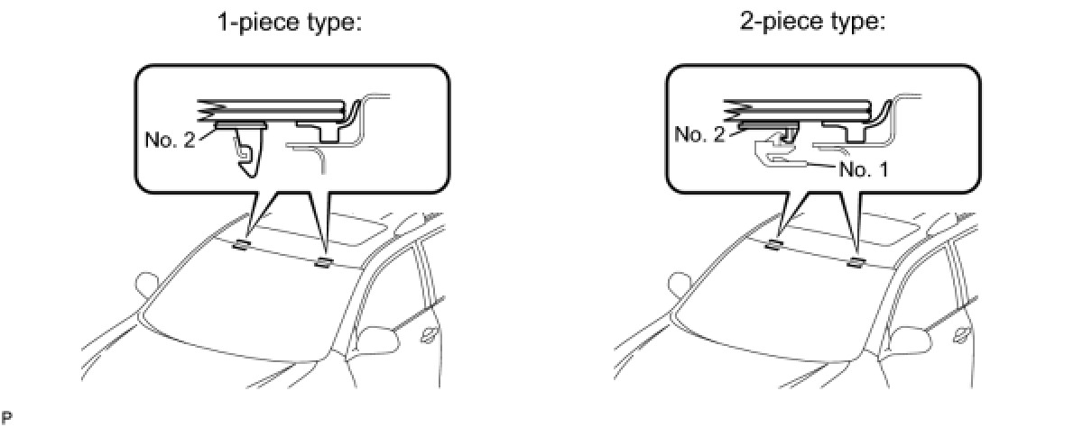* There are No. 1 and No. 2 stoppers on the windshield glass sub-assembly as shown in the illustration. Be careful not to damage the windshield glass when cutting off the adhesive.
