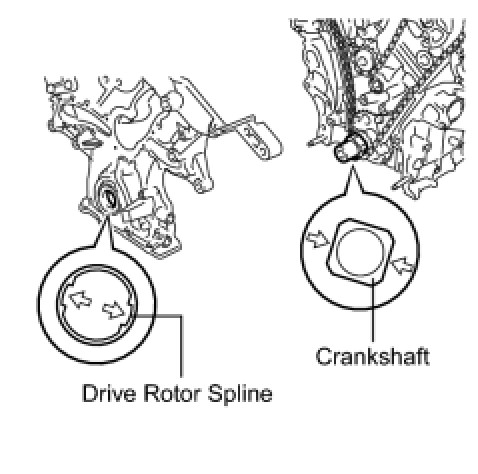 (d) Align the oil pump's drive rotor spline and the crankshaft as shown in the illustration. Install the spline and chain cover to the crankshaft.