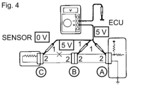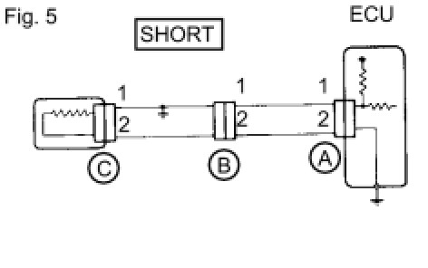 (a) If the wire harness is shorted to ground (Fig. 5), locate the section by conducting the following resistance check with body ground.