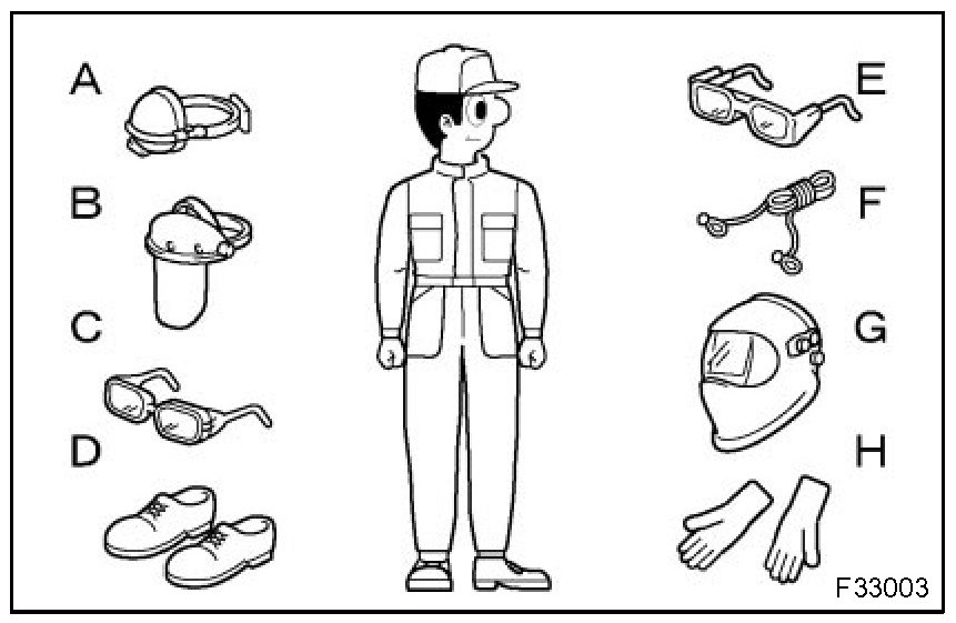 1. In addition to the usual mechanic's wear, cap and safety shoes, the appropriate gloves, head protector, welder's glasses, ear plugs, face protector, dust mask, etc. should be worn as the situation demands.