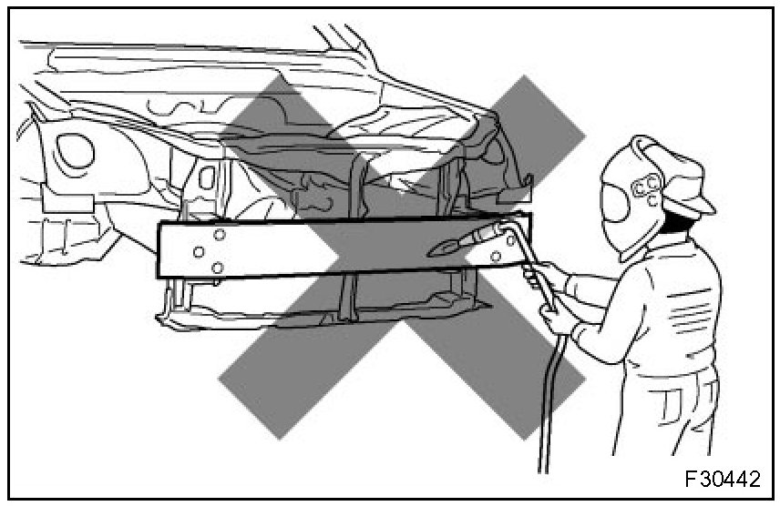 1. Rustproof high strength steel sheets are used for the body frame. Therefore, if these parts are heat repaired using an acetylene torch or equivalent, the crystalline structure changes, causing the strength of the steel sheets to decrease. Also, the zinc coating which is used to protect the body from rust will be damaged. This causes the surface of the steel sheets to become oxidized, which reduces their ability to resist rust.