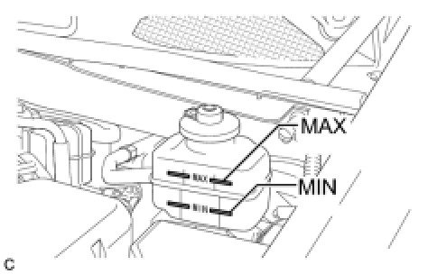 If brake fluid level is lower than the MIN line, check for leaks and inspect the disc brake pads. If necessary, refill the reservoir with brake fluid to the MAX line after repair or replacement.