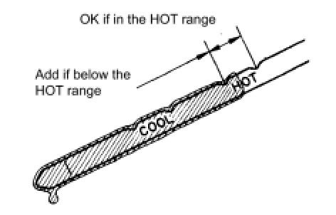 If the fluid level is below the HOT range, add new fluid and recheck the fluid level.