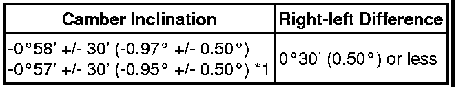 Camber is not adjustable. If the measurement is not within the specified range, inspect the suspension parts for damage and/or wear, and replace them if necessary.