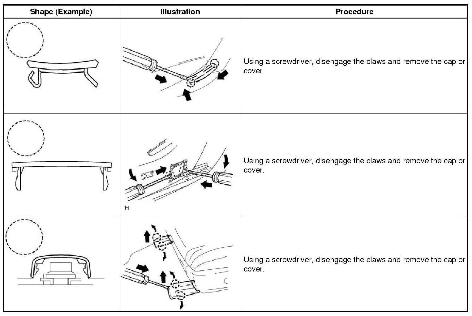 (1) The removal and installation methods of typical claws used for vehicle body parts are shown in the table below.