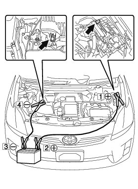 (4) Using booster cables, connect the 12 V battery of the rescue vehicle and the auxiliary battery of the stalled vehicle as shown in the illustration.