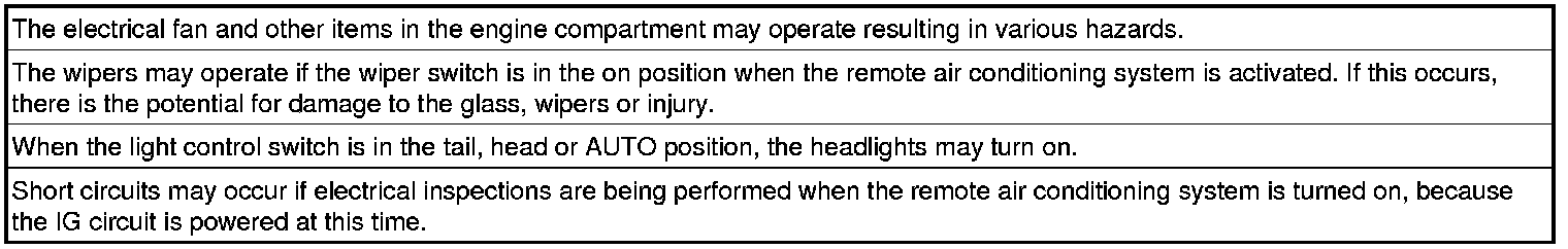 (a) Vehicles with the remote air conditioning system have the following risks that it is necessary to be aware of when performing repairs. Therefore, make sure to take care of the key (electrical transmitter) carefully so that the remote air conditioning system is not operated unexpectedly.
