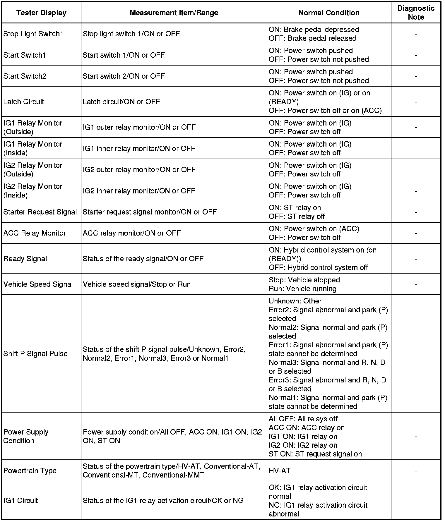 Using the Techstream to read the Data List allows the values or states of switches, sensors, actuators and other items to be read without removing any parts. This non-intrusive inspection can be very useful because intermittent conditions or signals may be discovered before parts or wiring is disturbed. Reading the Data List information early in troubleshooting is one way to save diagnostic time.