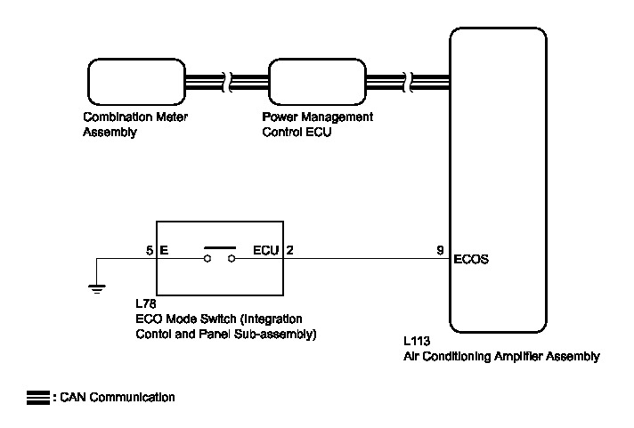 When selecting ECO drive mode, the ECO mode switch (integration control and panel sub-assembly) operation signal is sent to the air conditioning amplifier assembly. Following this, ECO drive mode control is activated for the heater and air conditioning system.