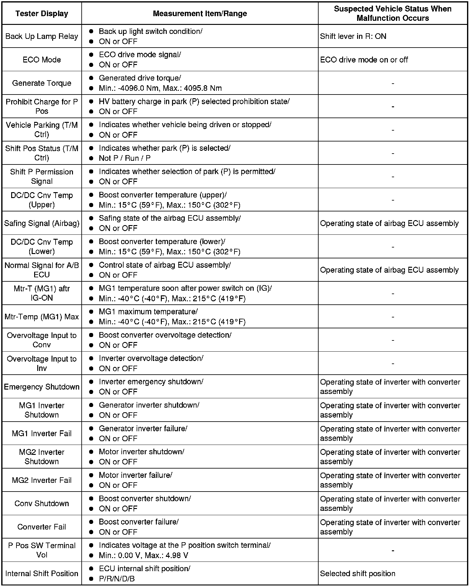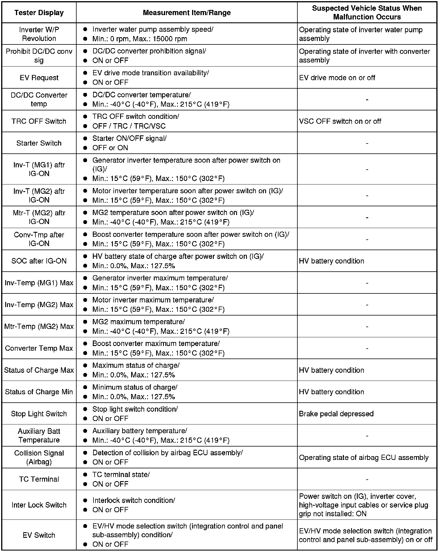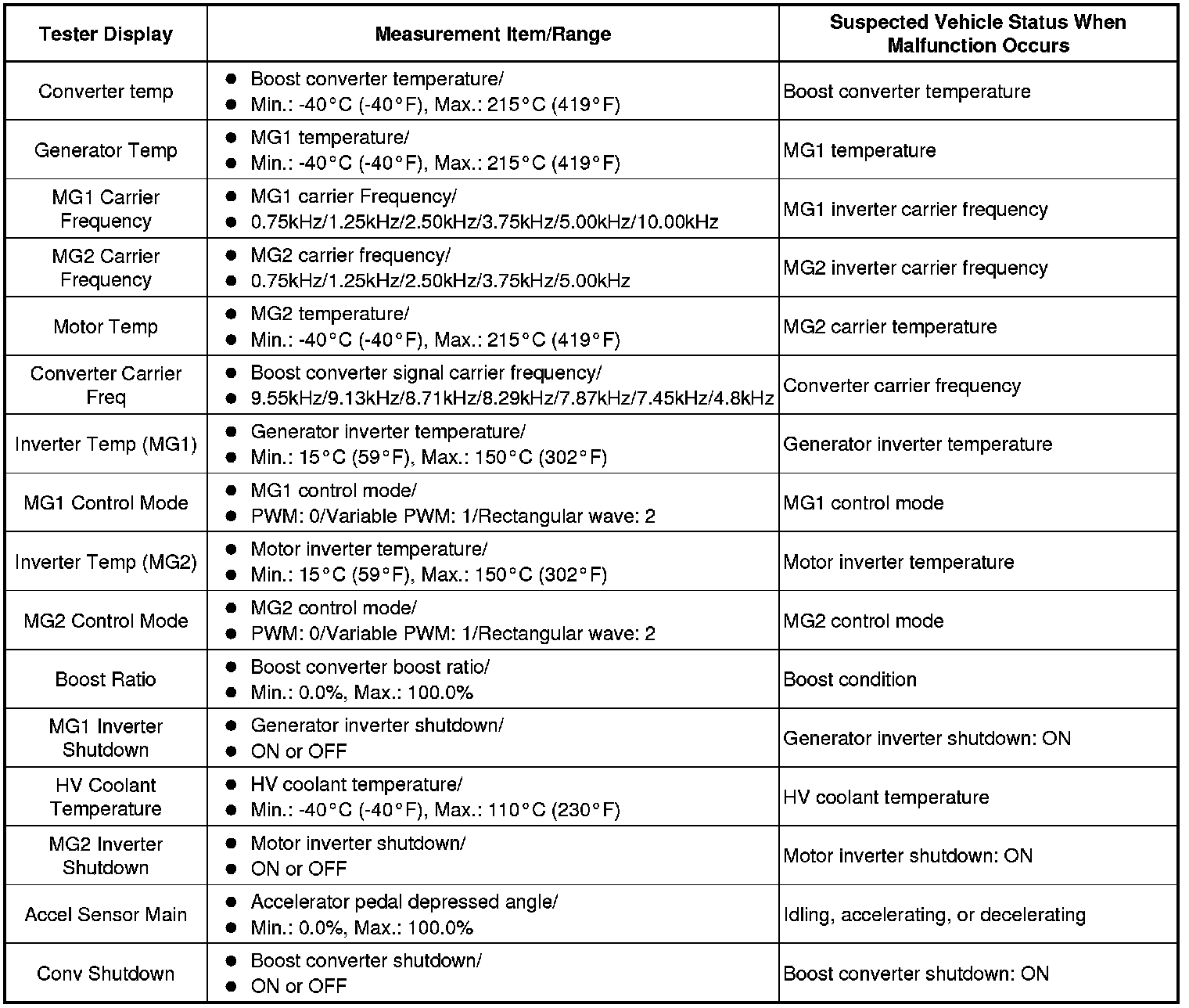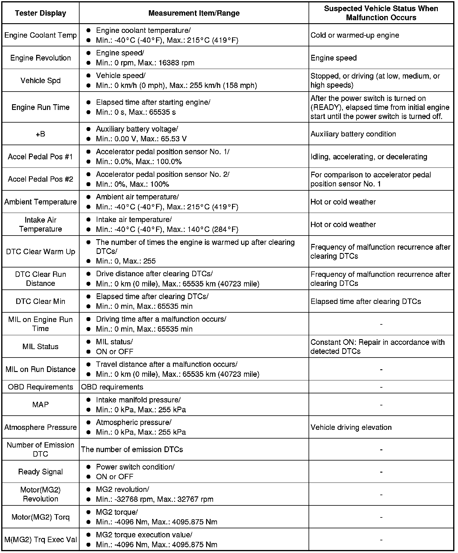 The power management control ECU records vehicle and driving condition information as freeze frame data the moment a DTC is stored. It can be used for estimating or duplicating the vehicle conditions that were present when the malfunction occurred. To confirm the details of the hybrid control system, check the detailed information for the DTC information code in the Data List (INF code).