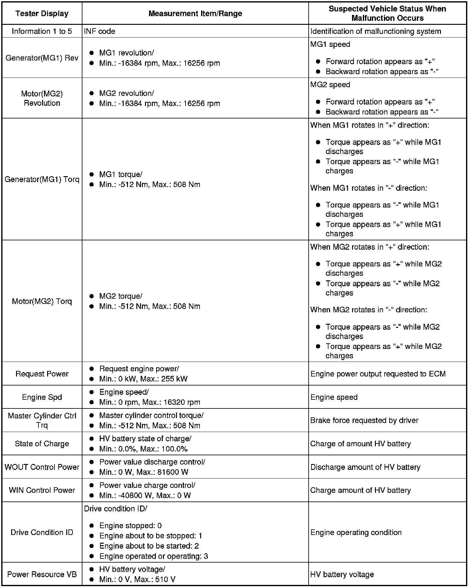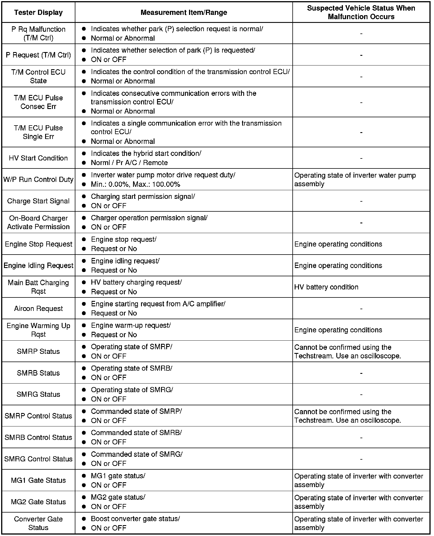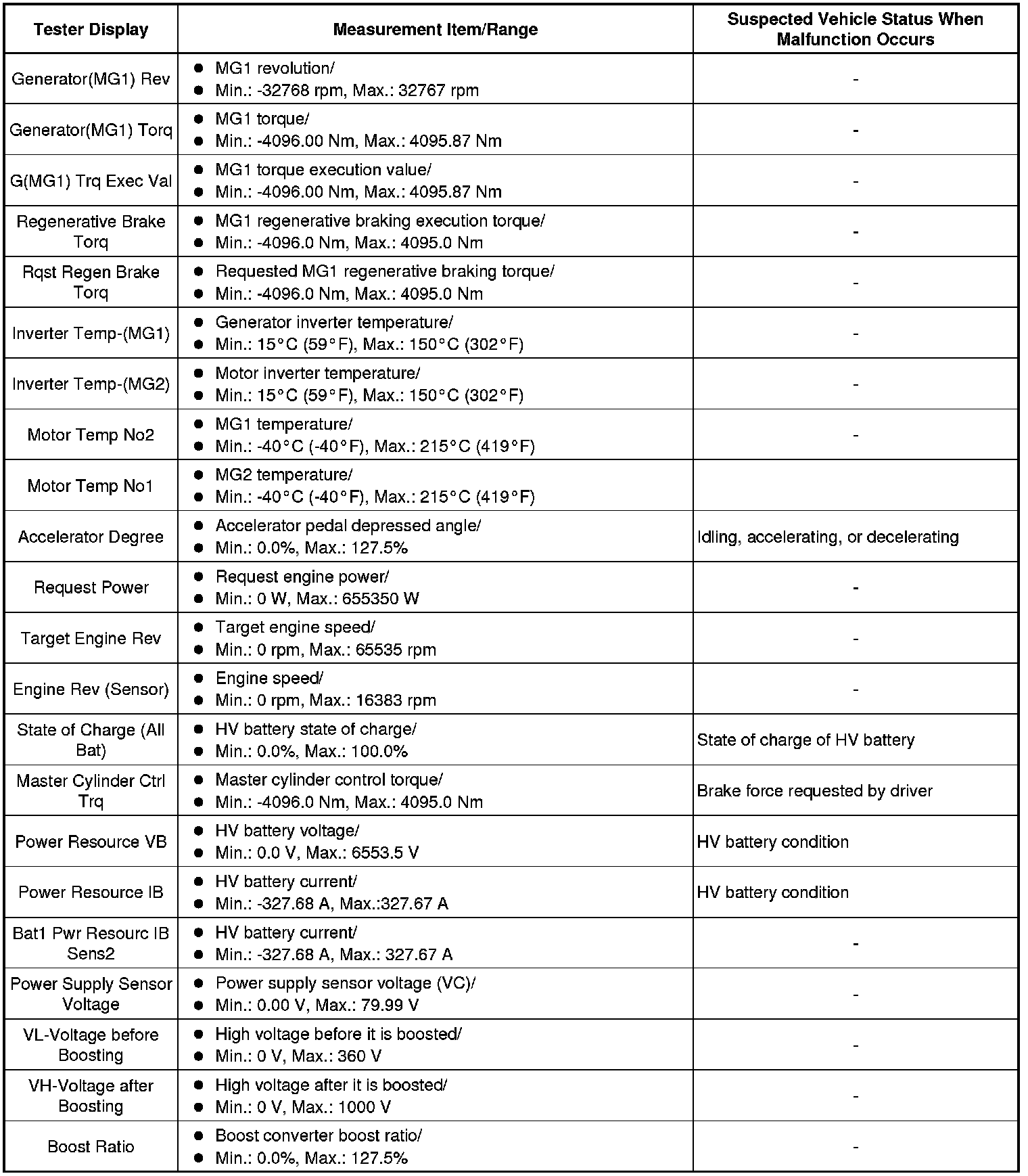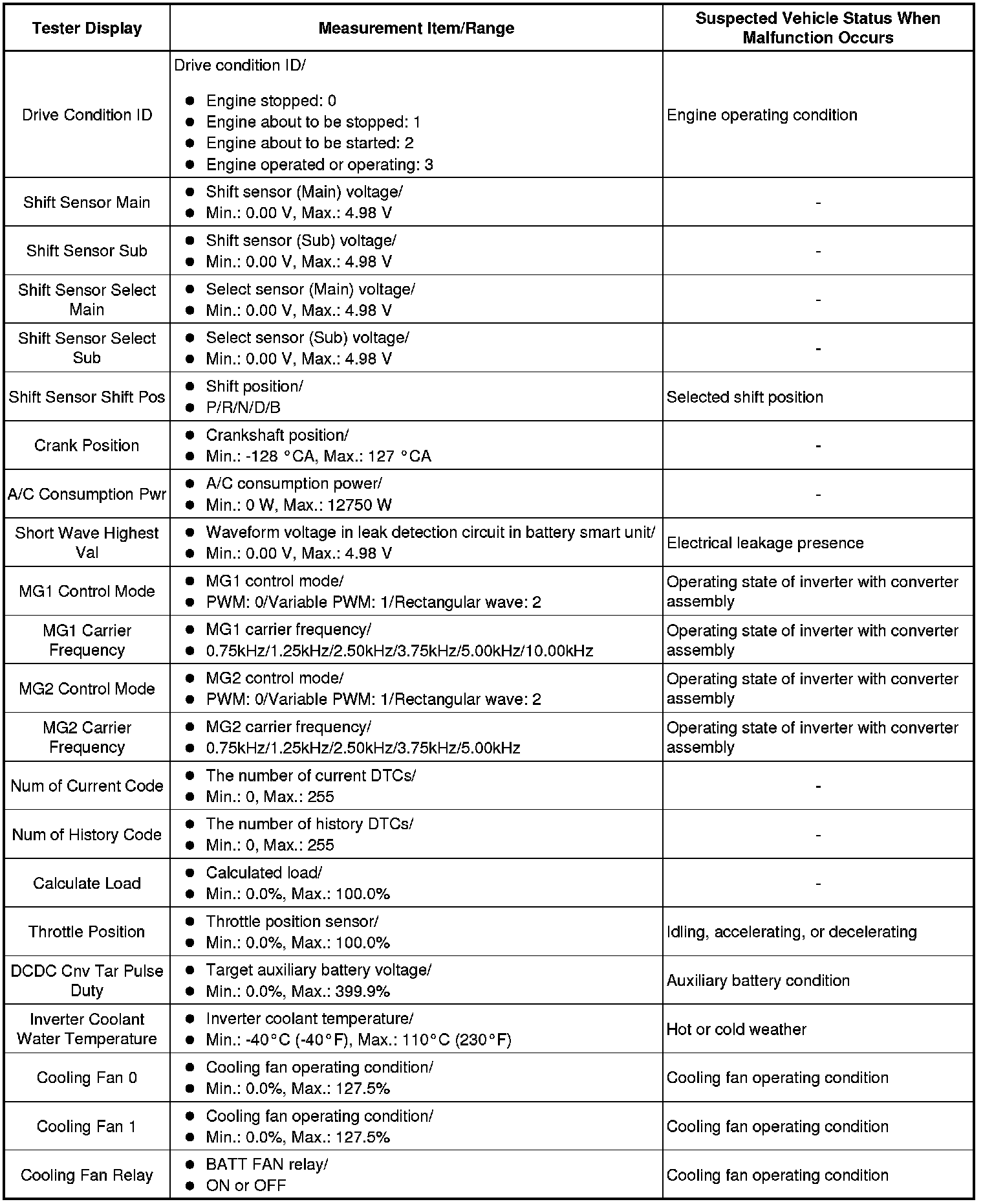 The power management control ECU records vehicle and driving condition information as freeze frame data the moment a DTC is stored. It can be used for estimating or duplicating the vehicle conditions that were present when the malfunction occurred. To confirm the details of the hybrid control system, check the detailed information for the DTC information code in the Data List (INF code).
