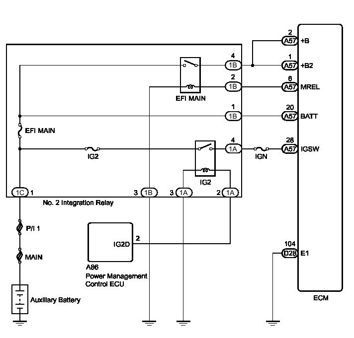 When the power switch is turned on (IG), auxiliary battery voltage is applied to IGSW of the ECM. The output signal from the MREL terminal of the ECM causes a current to flow to the coil, closing the contacts of the No. 2 integration relay (EFI MAIN relay) and supplying power to either terminal +B and +B2 of the ECM.
