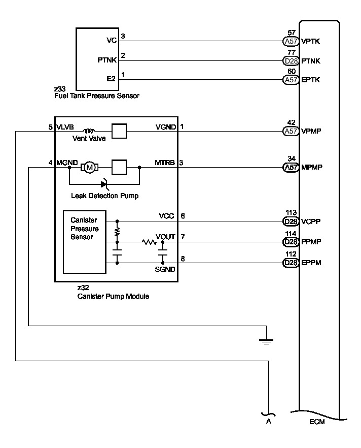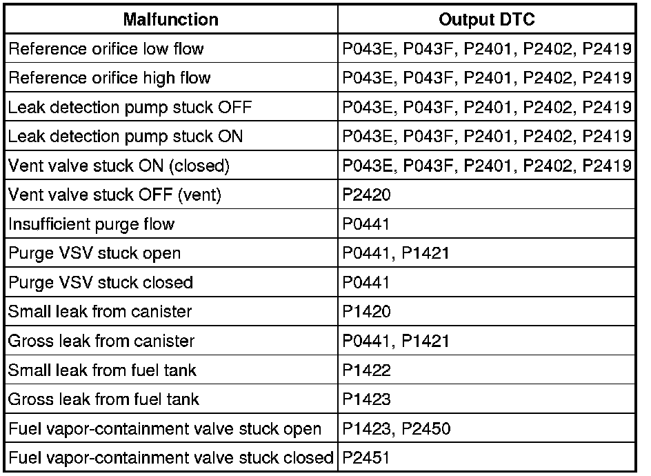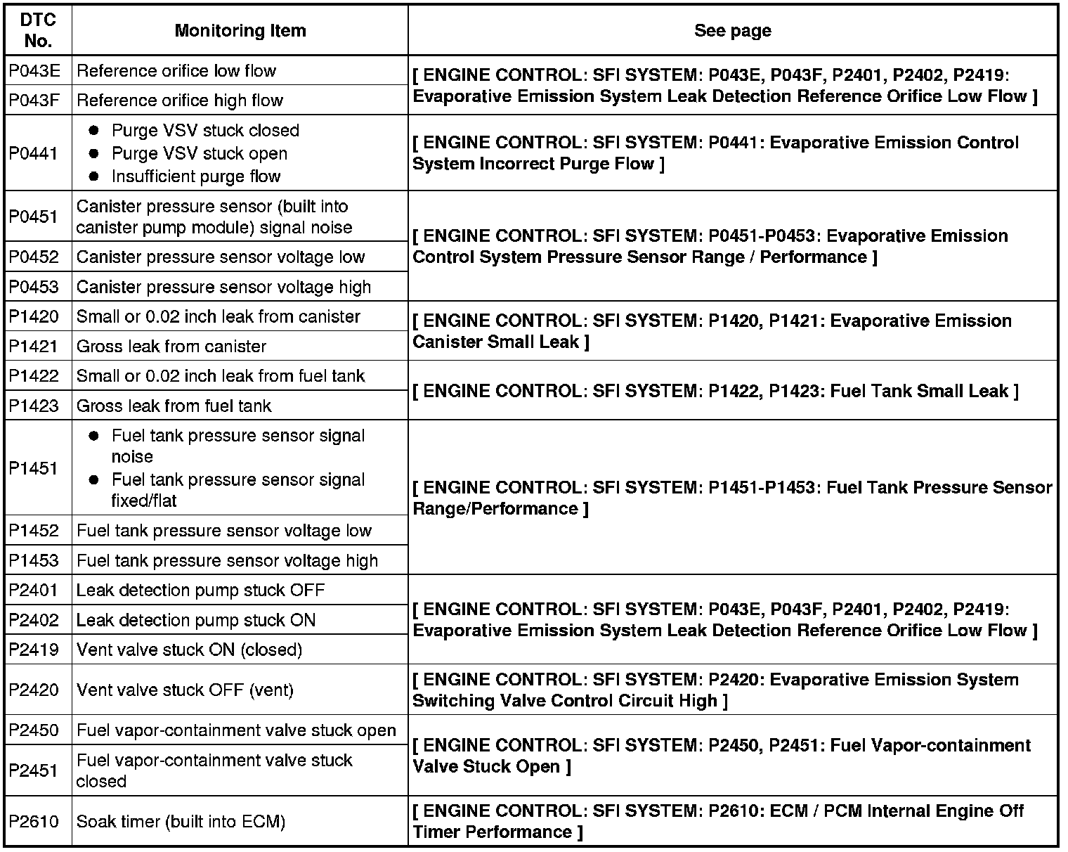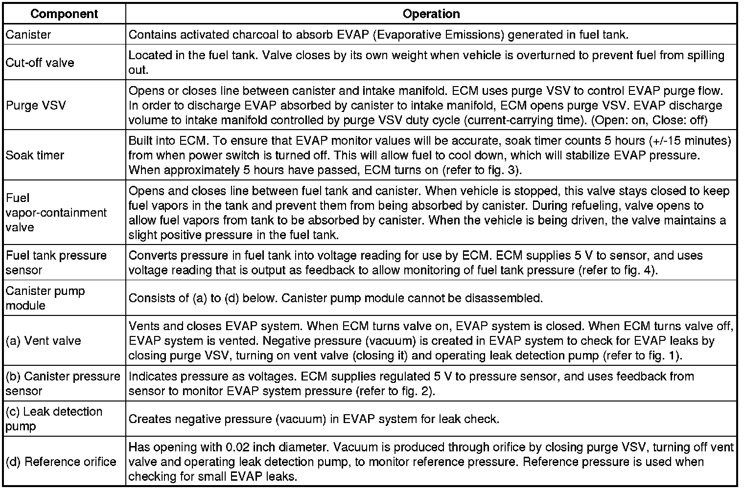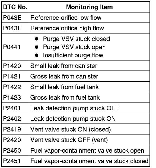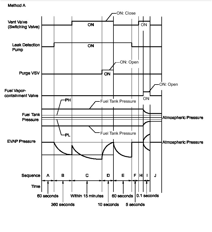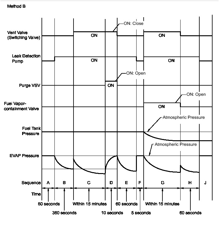 The leak detection pump creates negative pressure (vacuum) in the EVAP system and the pressure is measured. Finally, the ECM monitors for leaks from the EVAP system, and malfunctions in both the canister pump module and purge VSV based on the EVAP pressure.