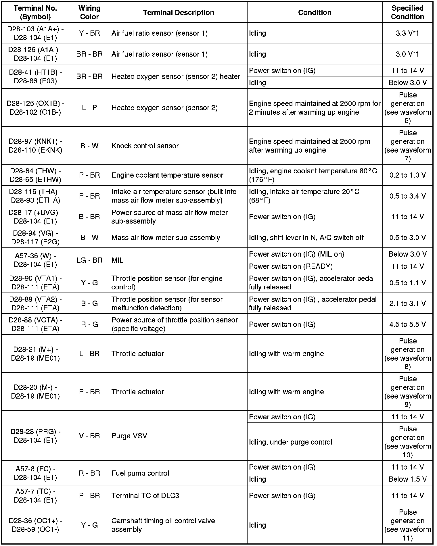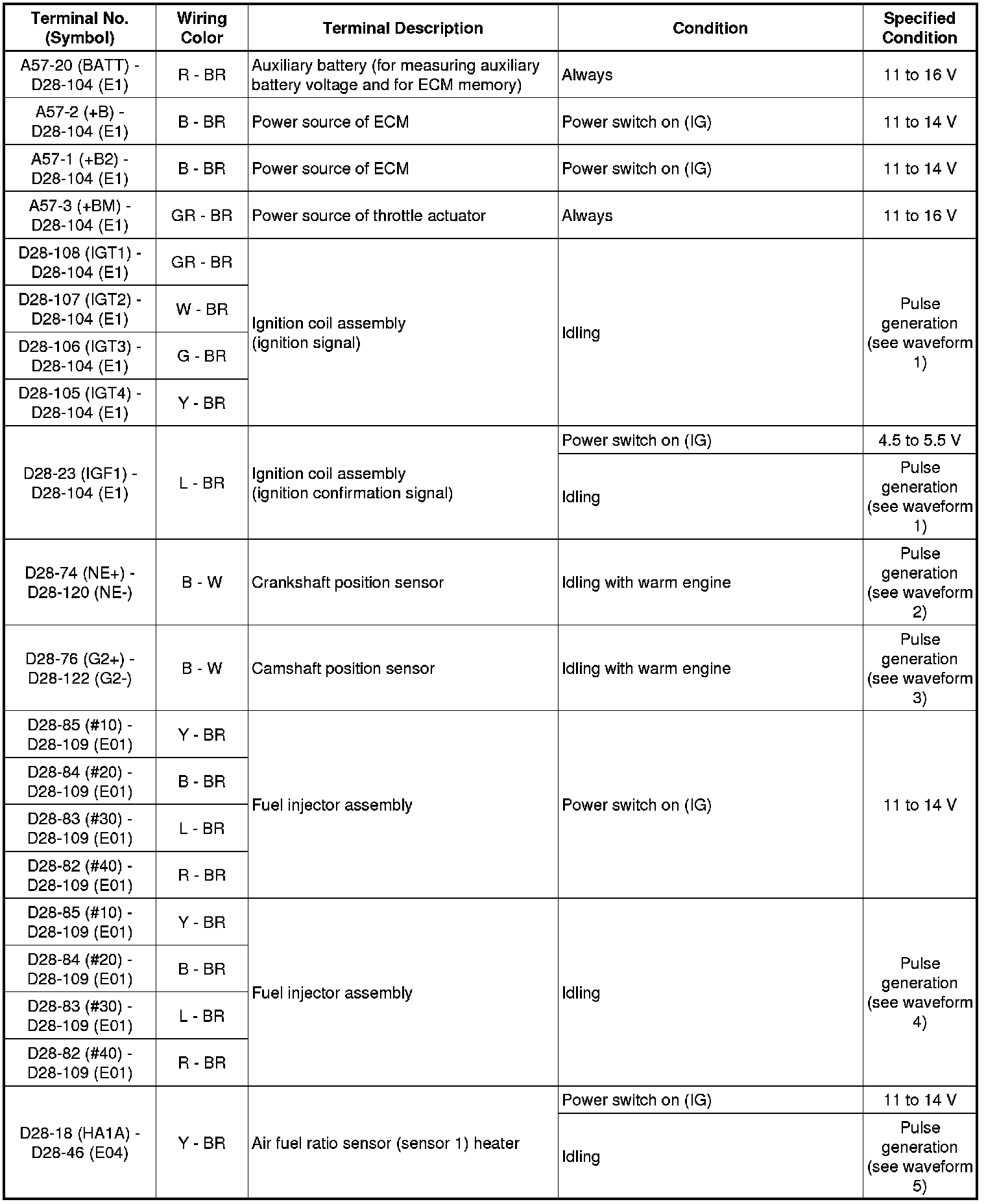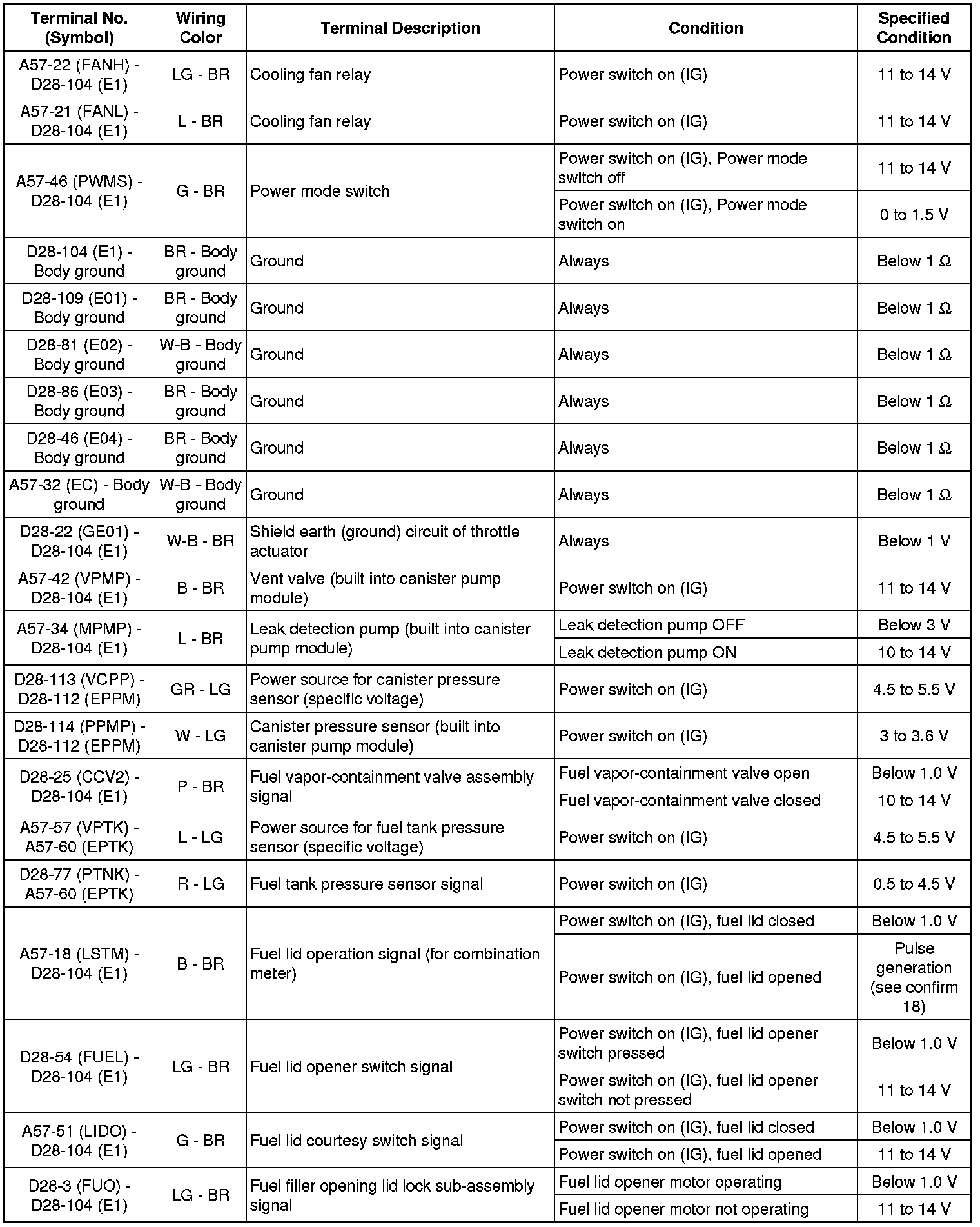 The standard normal voltage between each pair of the ECM terminals is shown in the table below. The appropriate conditions for checking each pair of the terminals are also indicated. The result of checks should be compared with the standard normal voltage for that pair of the terminals, and displayed in the "Specified Condition" column. The illustration above can be used as a reference to identify the ECM terminal locations.