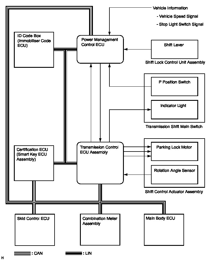 The transmission control ECU assembly locks/unlocks gearshift control based on lock/unlock request signals from the certification ECU (smart key ECU assembly).