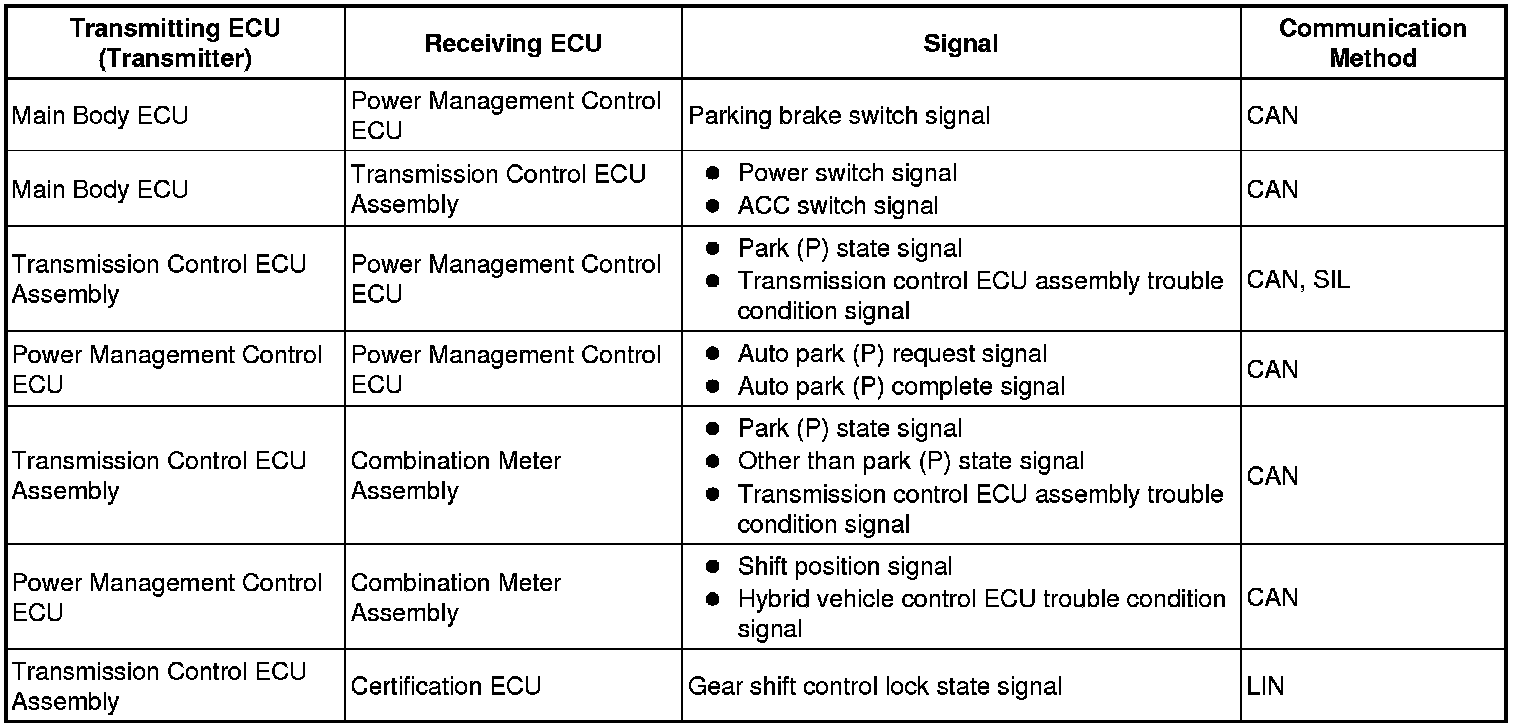 The transmission control ECU assembly receives the theft deterrent status (lock or unlock) from the certification ECU (smart key ECU assembly).