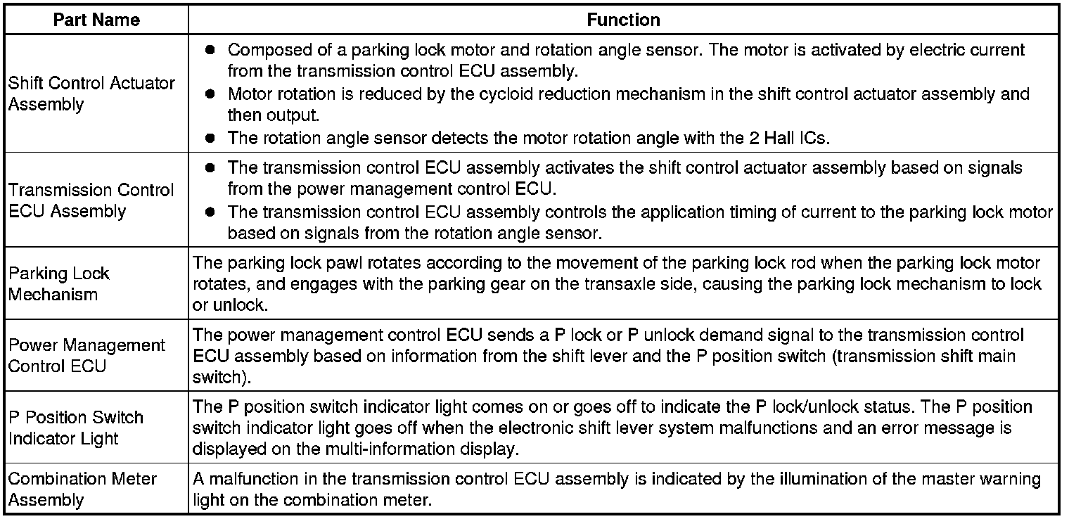 (a) The electronic shift lever system comprehensively determines vehicle conditions and changes the shift state, as shown in the following chart, by cooperating with the shift control function of the hybrid system (except when the reject function described later is in operation).