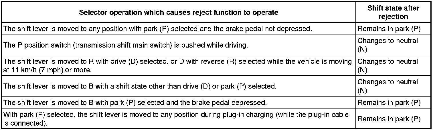(a) In the electronic shift lever system, there may be a situation in which a shift state change cannot be done for safety reasons. When attempting to move the shift lever in such a situation, the system sounds a reject buzzer inside the meter and changes the shift state as shown in the following table.