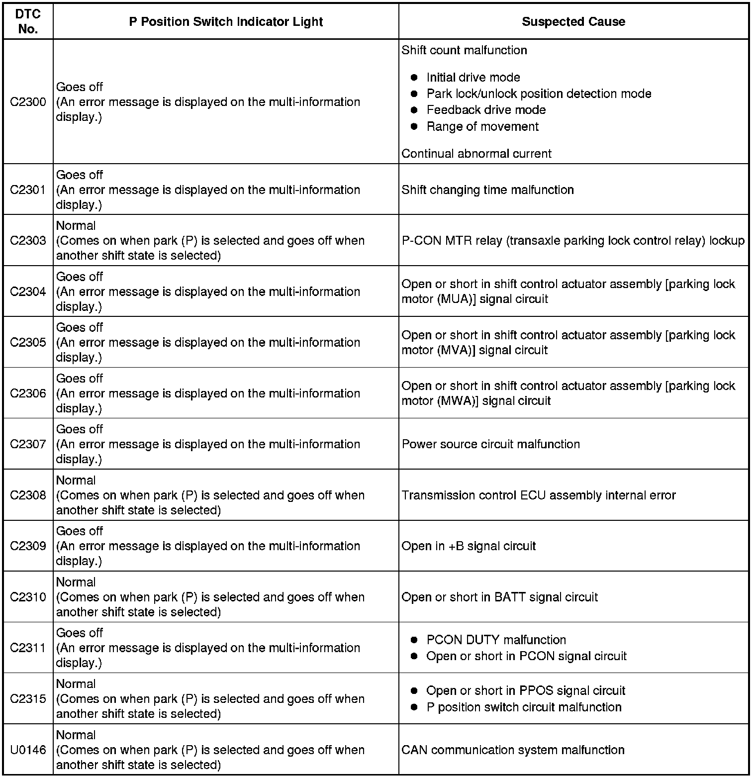 Even if the system has returned to normal, with park (P) selected, the P position switch indicator light does not return to normal without selecting a shift state other than park (P). (Normal refers to the P position switch indicator light coming on when park (P) is selected and going off when another shift state is selected.)