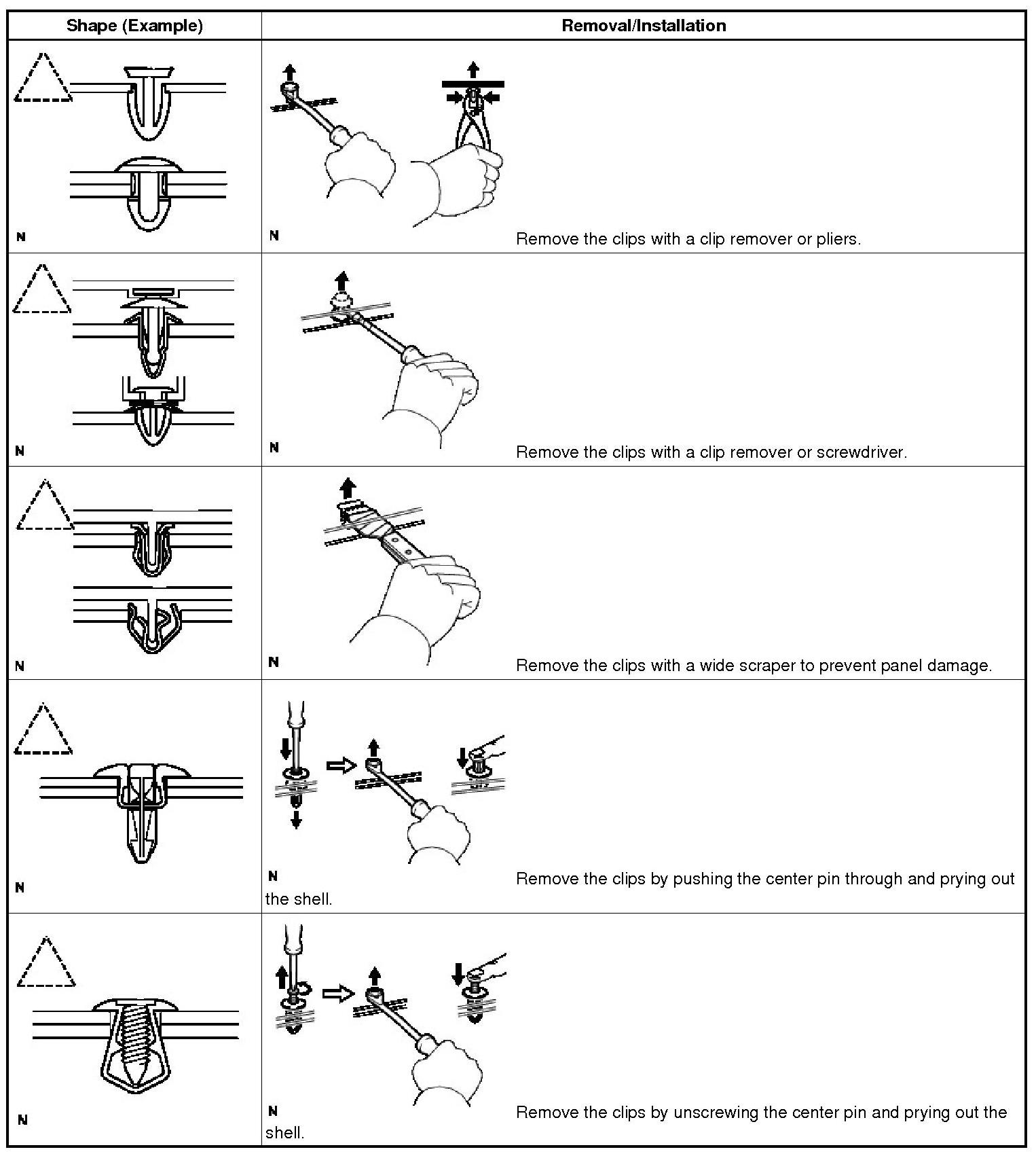(1) The removal and installation methods of typical clips used for vehicle body parts are shown in the table below.