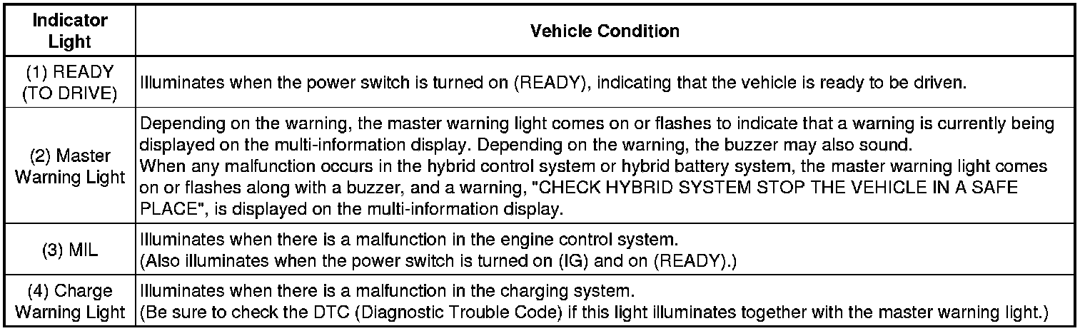 (a) If one of the warning lights (2) to (4) illuminates, connect the Techstream to the DLC3 to check the DTCs (Diagnostic Trouble Codes). Then, refer to the applicable troubleshooting steps in this manual to inspect and repair the affected area. The foregoing actions are also required if the READY light does not illuminate when attempting to turn the power switch on (READY).