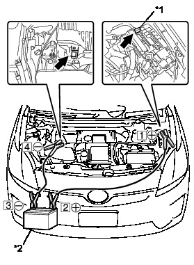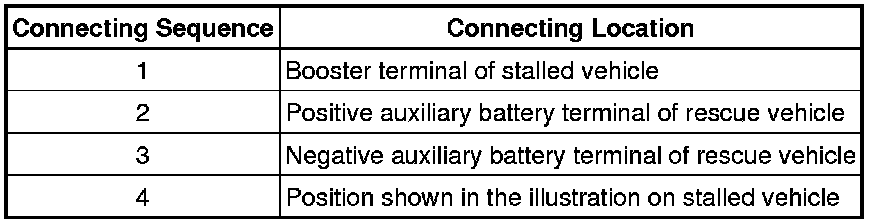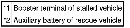 (3) Using booster cables, connect the 12 V auxiliary battery of the rescue vehicle and the auxiliary battery of the stalled vehicle as shown in the illustration.