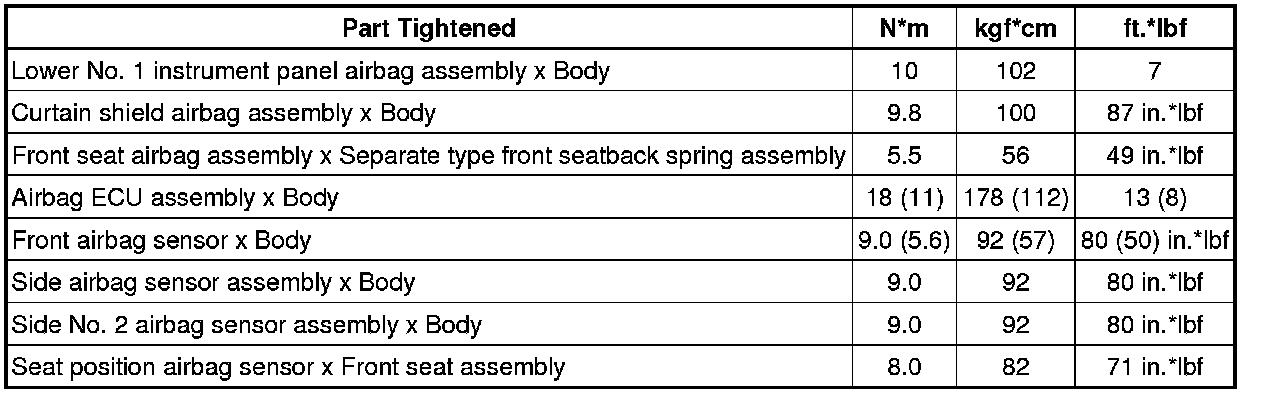 SPECIFICATIONS: SUPPLEMENTAL RESTRAINT SYSTEMS: TORQUE SPECIFICATIONS