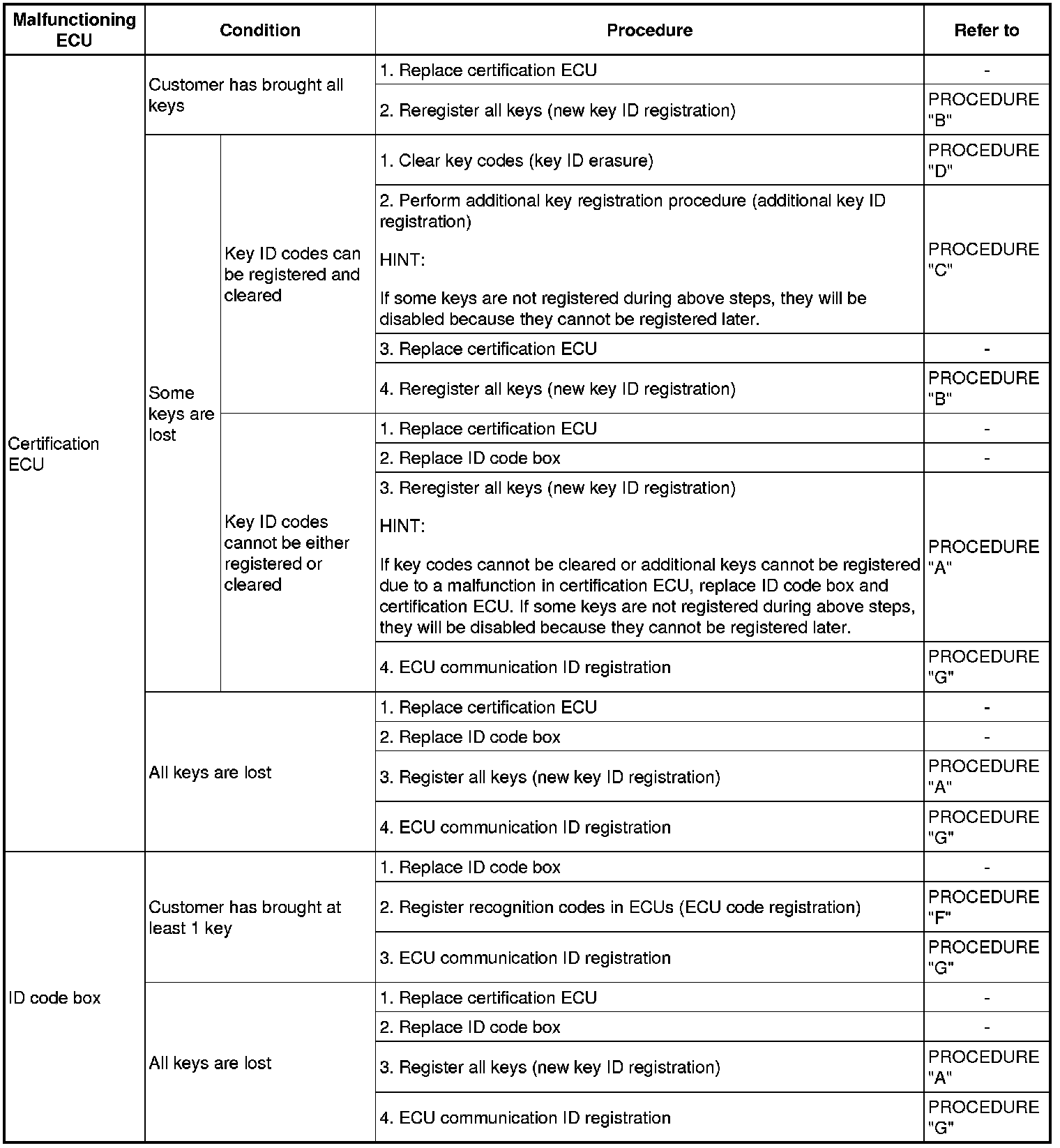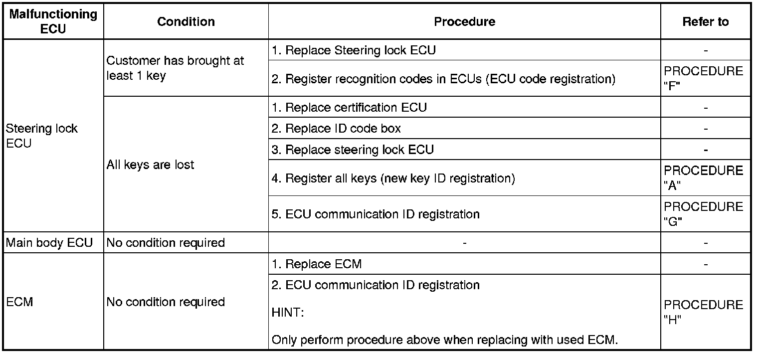 (a) If a malfunctioning ECU is discovered through troubleshooting of the smart key system, use the ECU replacement and key registration procedures in the table below.