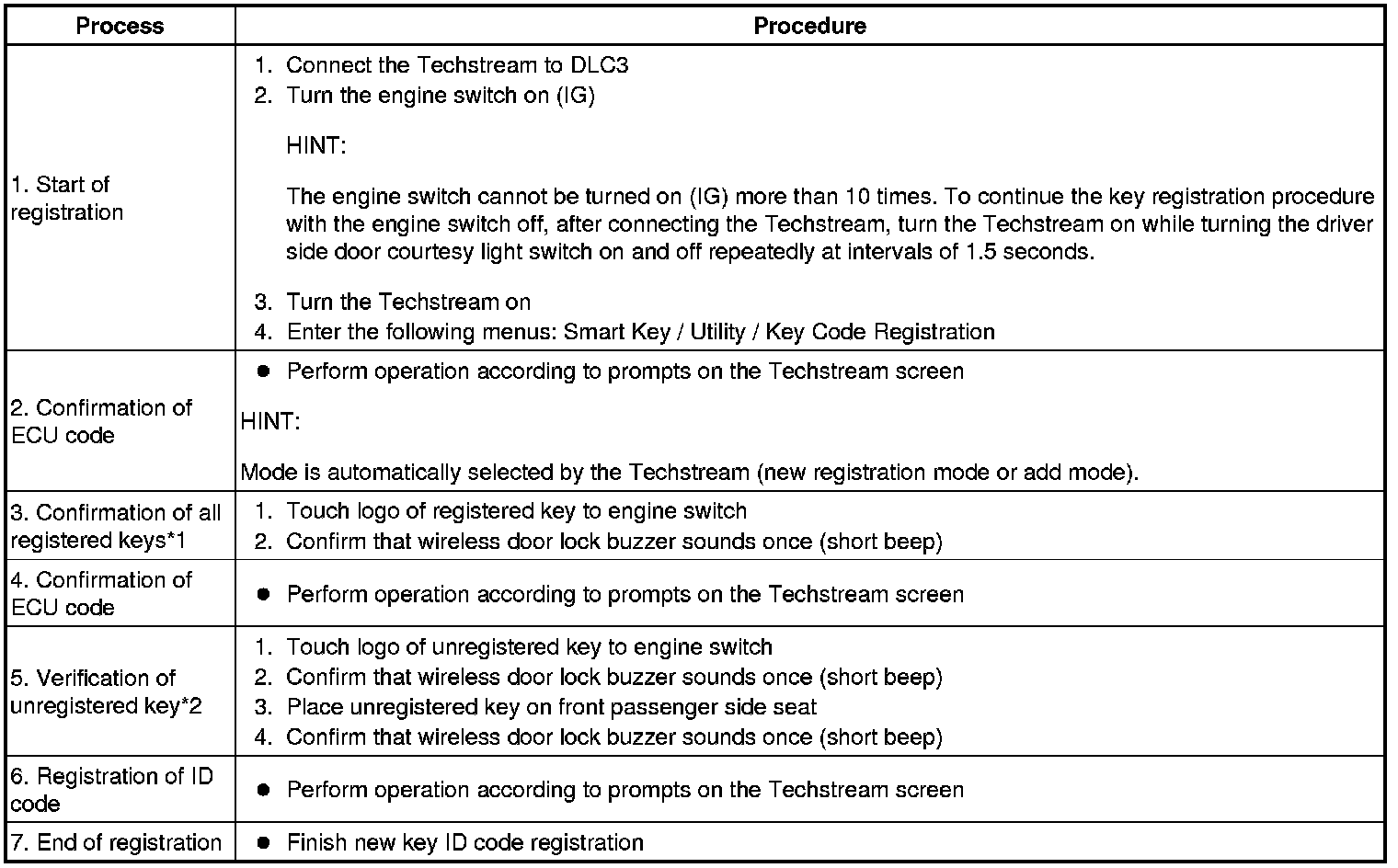 * *1: Perform this process for one of the keys registered to the vehicle. Finish the procedure within 30 seconds. If the procedure has not been finished within the specified time, perform the registration from process 1 again.