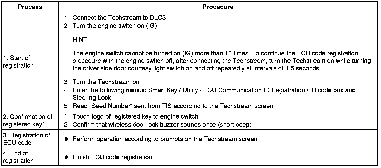 *: Perform this process for one of the keys registered to the vehicle. Finish the procedure within 30 seconds. If the procedure has not been finished within the specified time, perform the registration from process 1 again.
