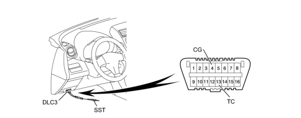 (1) Using SST, connect terminals 13 (TC) and 4 (CG) of the DLC3.