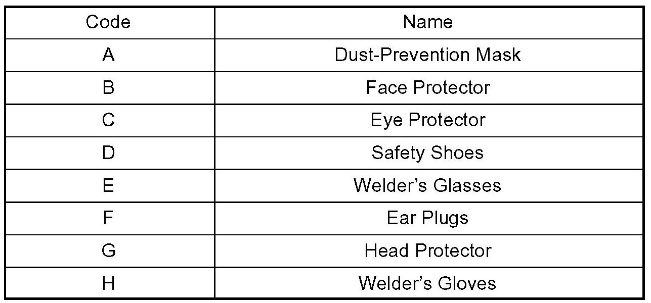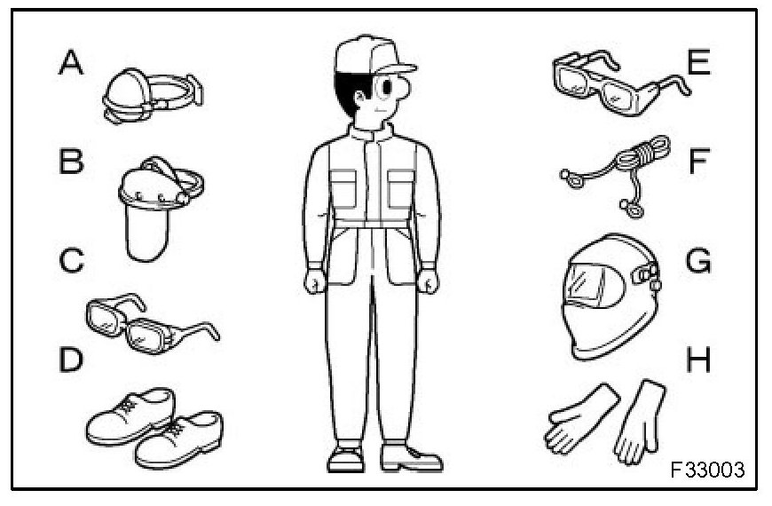 1. In addition to the usual mechanic's wear, cap and safety shoes, the appropriate gloves, head protector, glasses, ear plugs, face protector, dust-prevention mask, etc. should be worn as the situation demands.