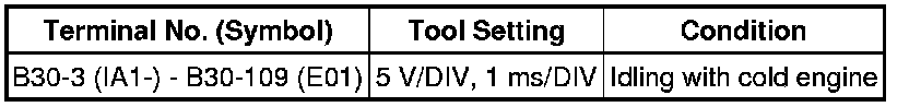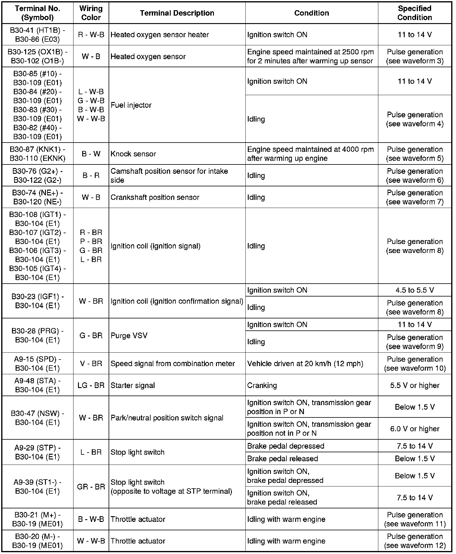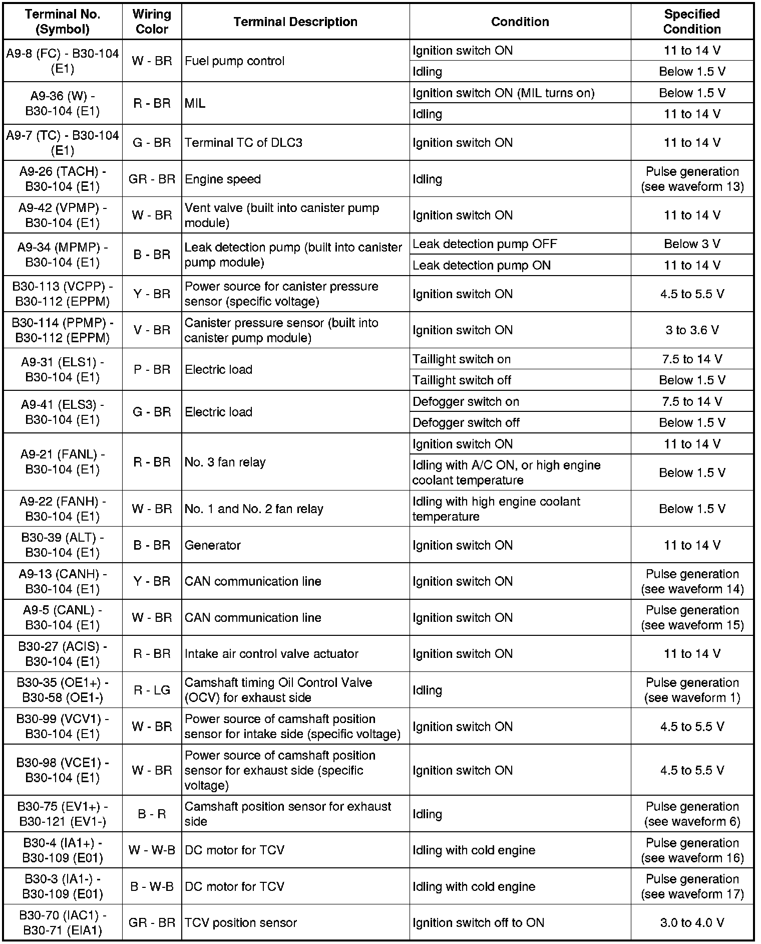 The standard voltage between each pair of ECM terminals is shown in the table below. The appropriate conditions for checking each pair of terminals are also indicated. The result of checks should be compared with the standard voltage for that pair of terminals, displayed in the Specified Condition column. The illustration above can be used as a reference to identify the ECM terminal locations.