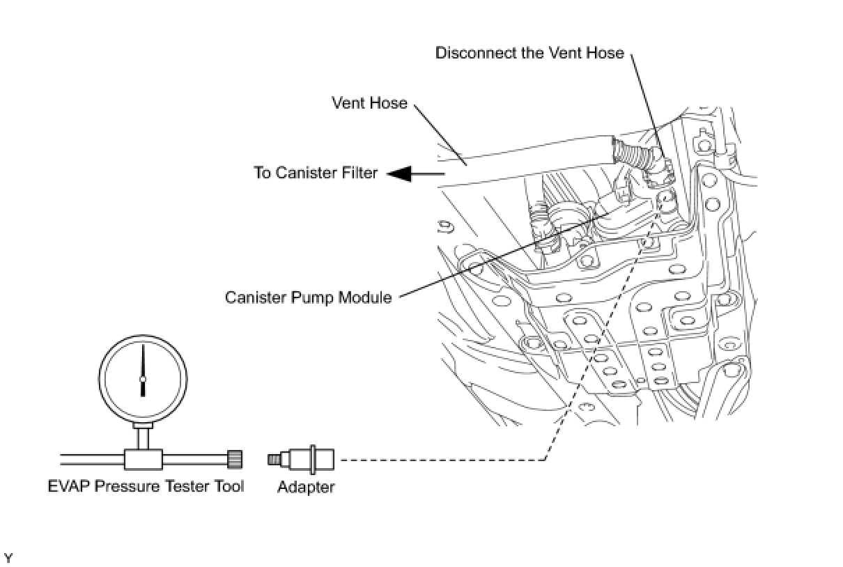(b) Connect the evaporative pressure tester tool to the canister pump module with the adapter.