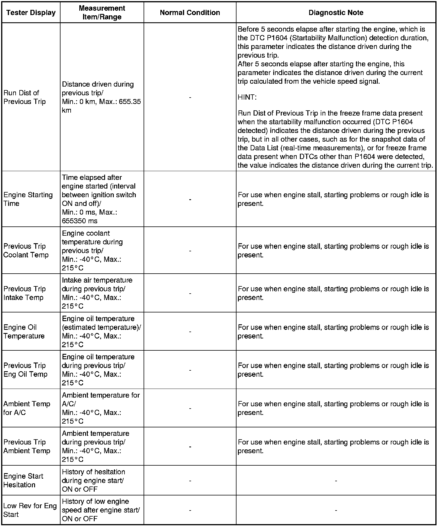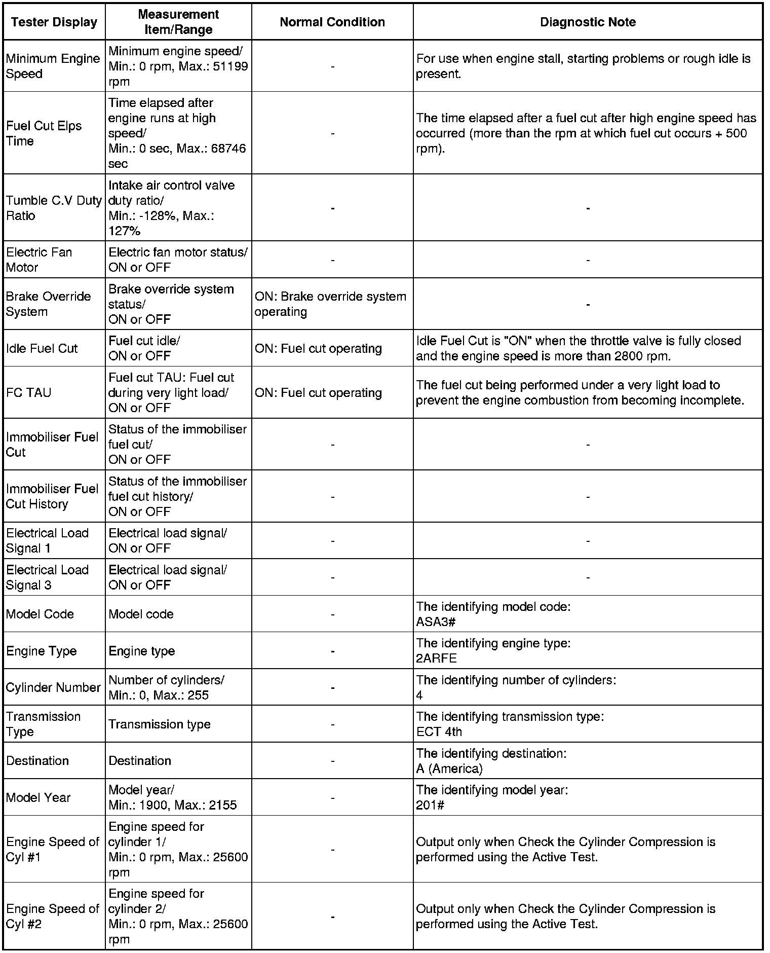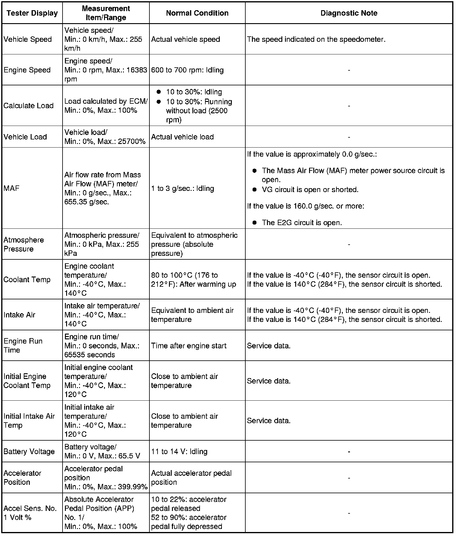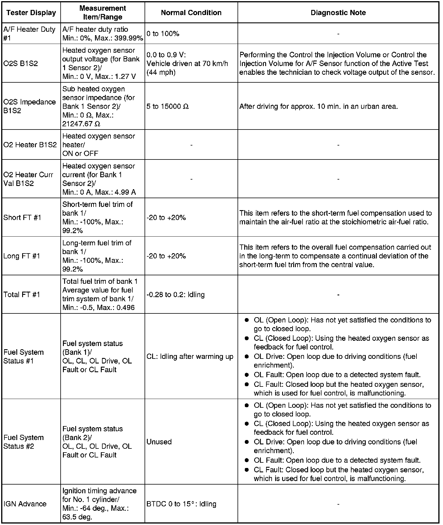 Using the Techstream to read the Data List allows the values or states of switches, sensors, actuators and other items to be read without removing any parts. This non-intrusive inspection can be very useful because intermittent conditions or signals may be discovered before parts or wiring is disturbed. Reading the Data List information early in troubleshooting is one way to save diagnostic time.