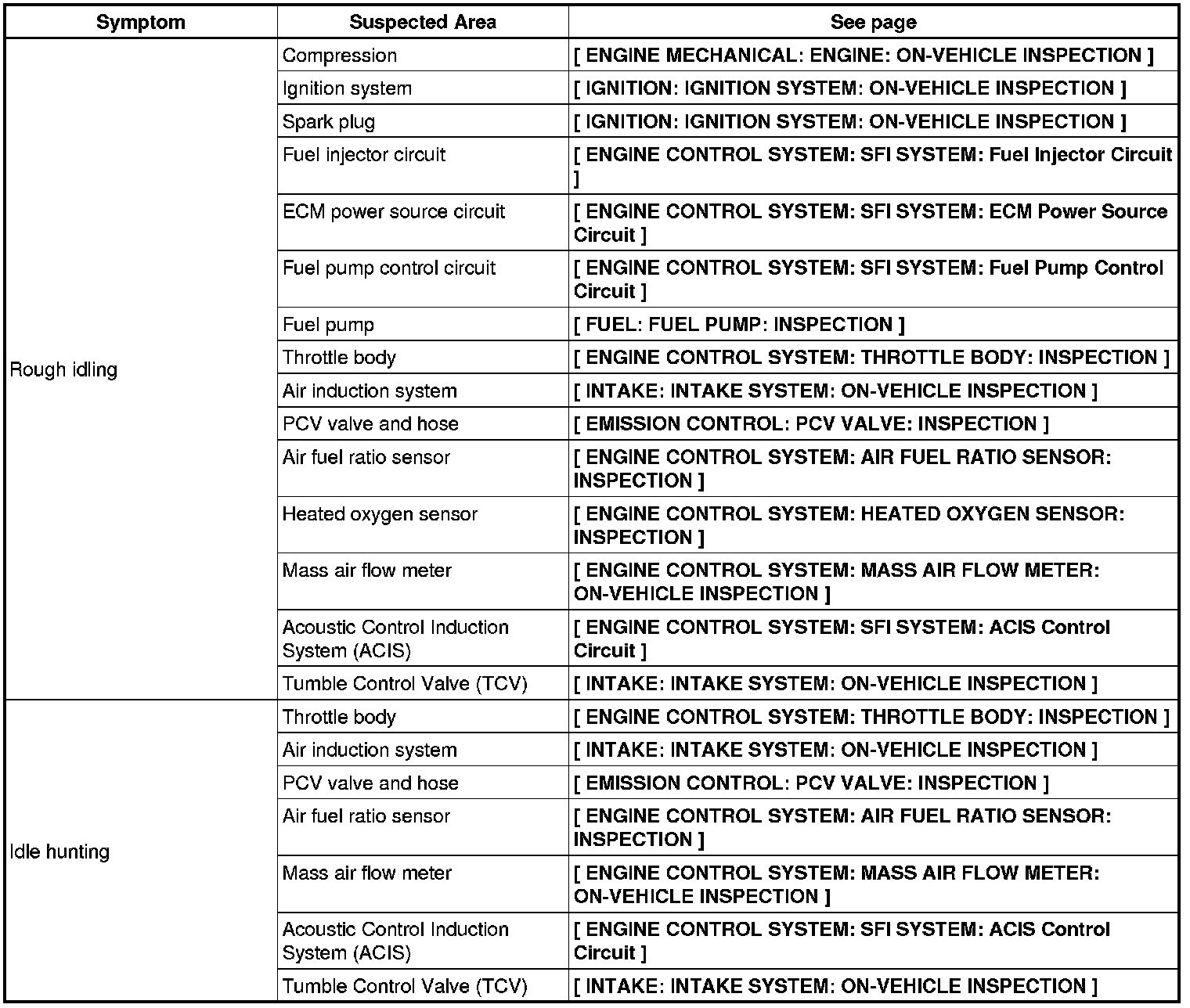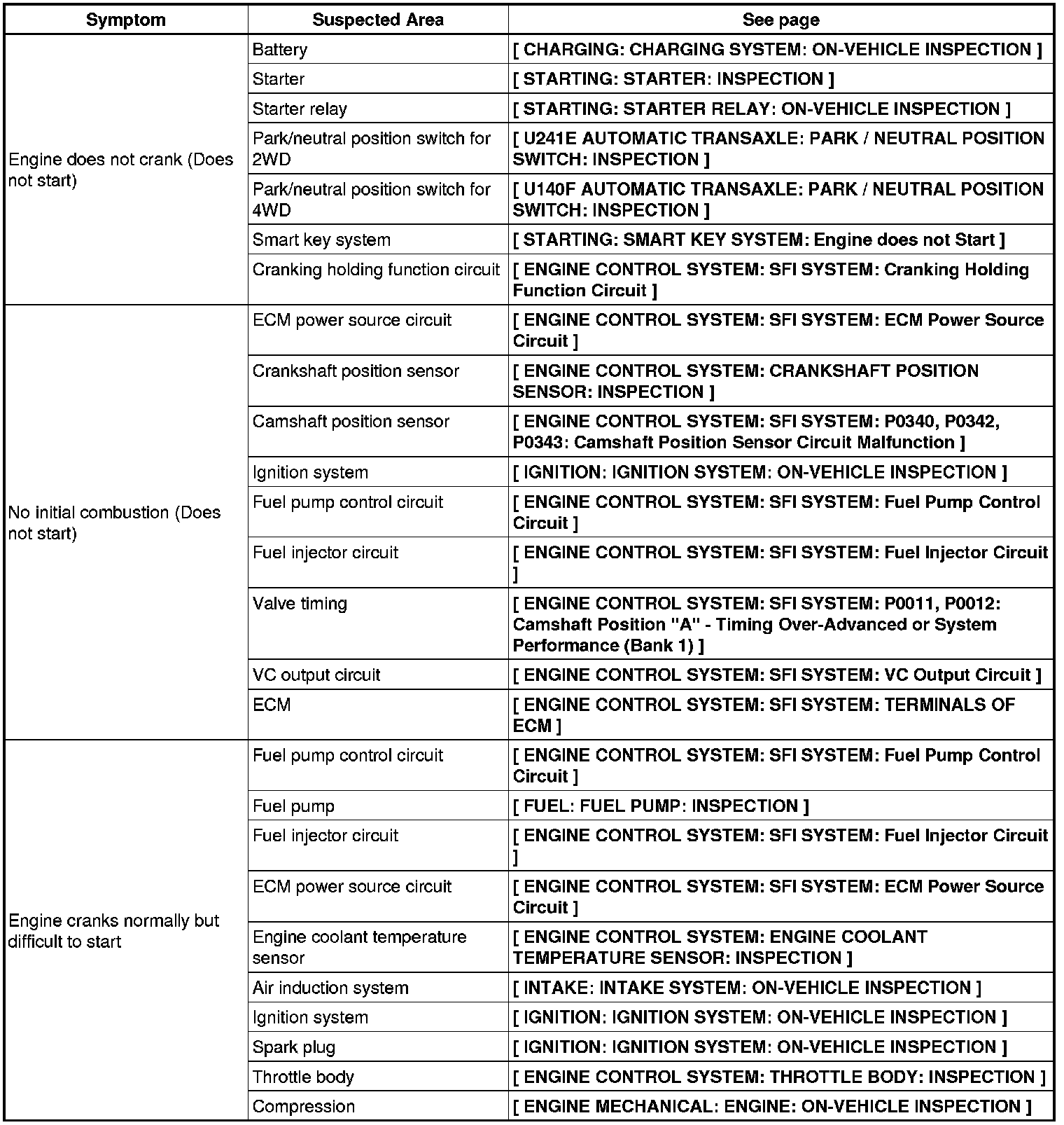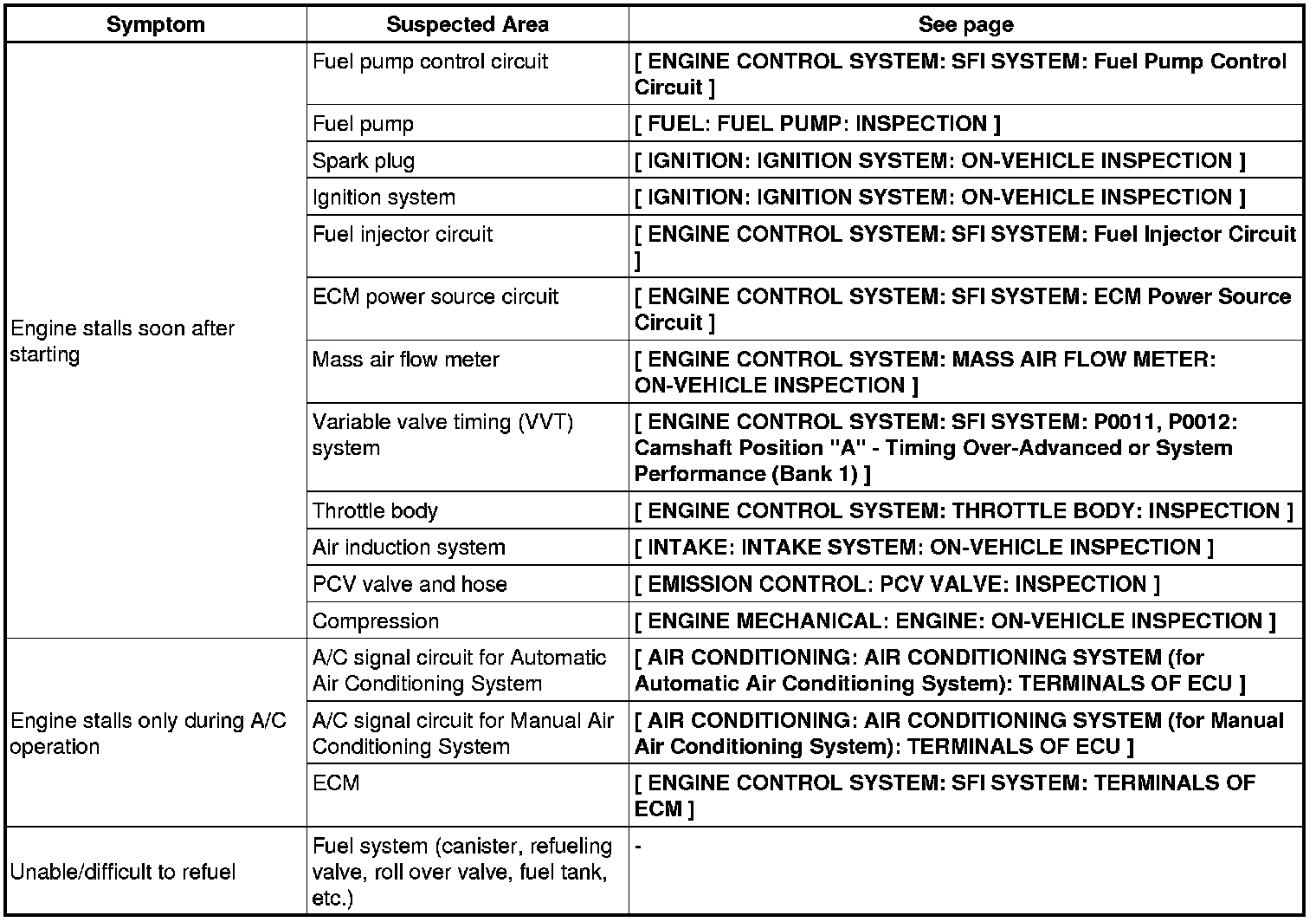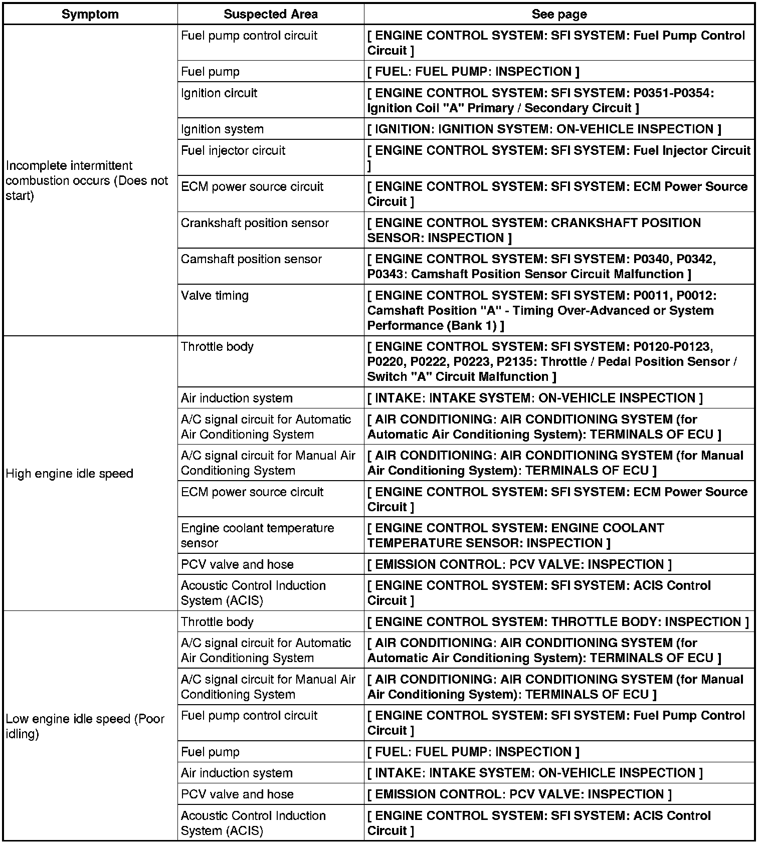 2AR-FE ENGINE CONTROL SYSTEM: SFI SYSTEM: PROBLEM SYMPTOMS TABLE