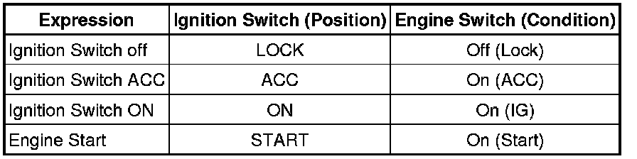 The type of ignition switch used on this model differs depending on the specifications of the vehicle. The expressions listed in the table below are used in this section.