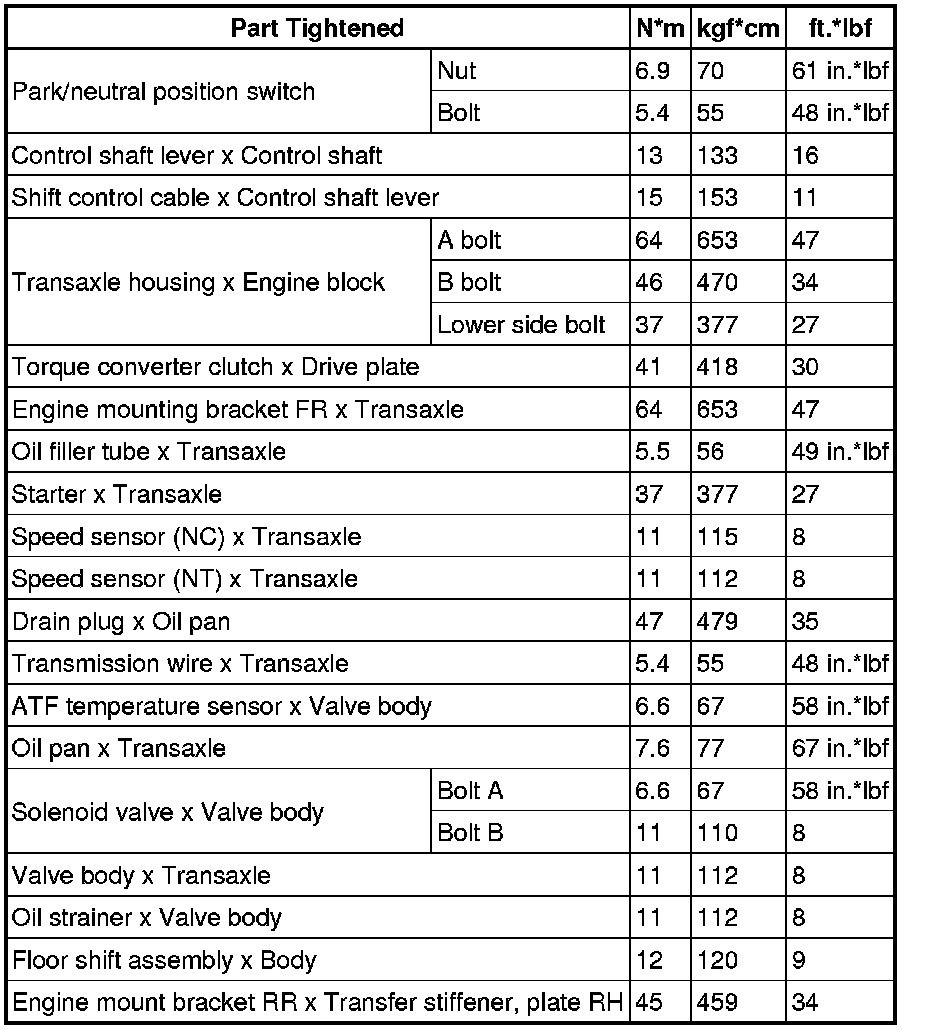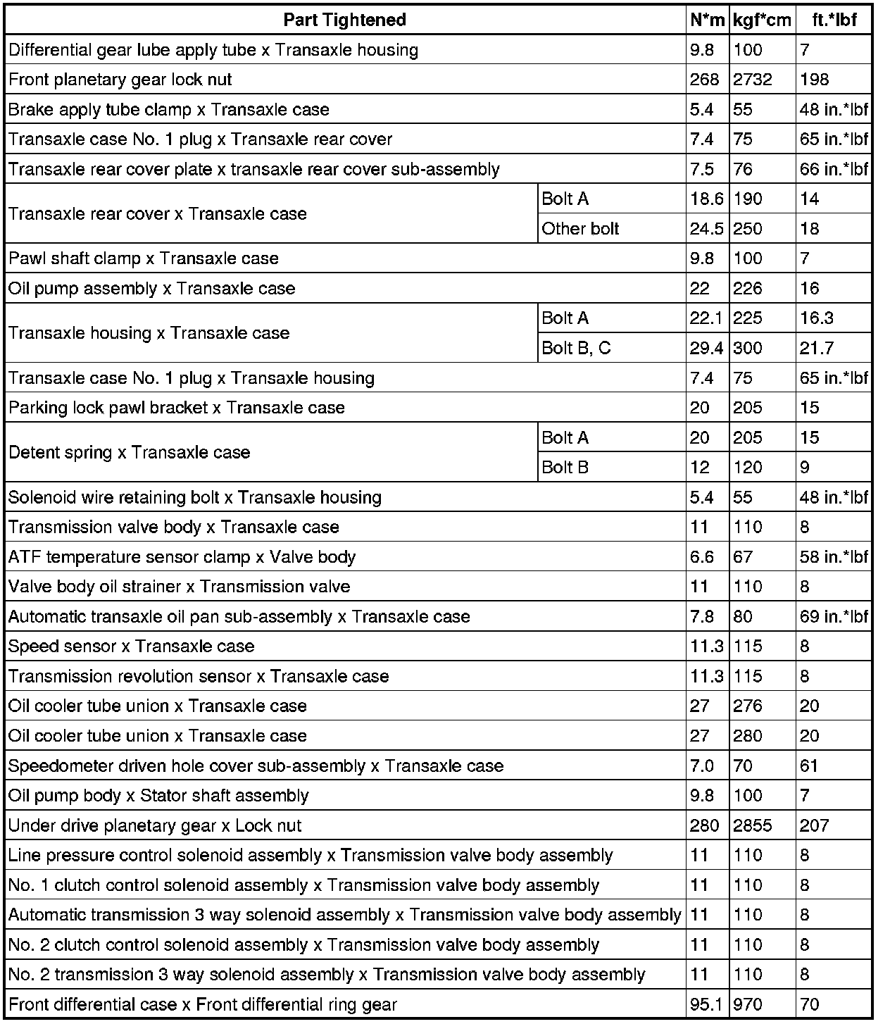 SERVICE SPECIFICATIONS: U241E AUTOMATIC TRANSAXLE: TORQUE SPECIFICATIONS
