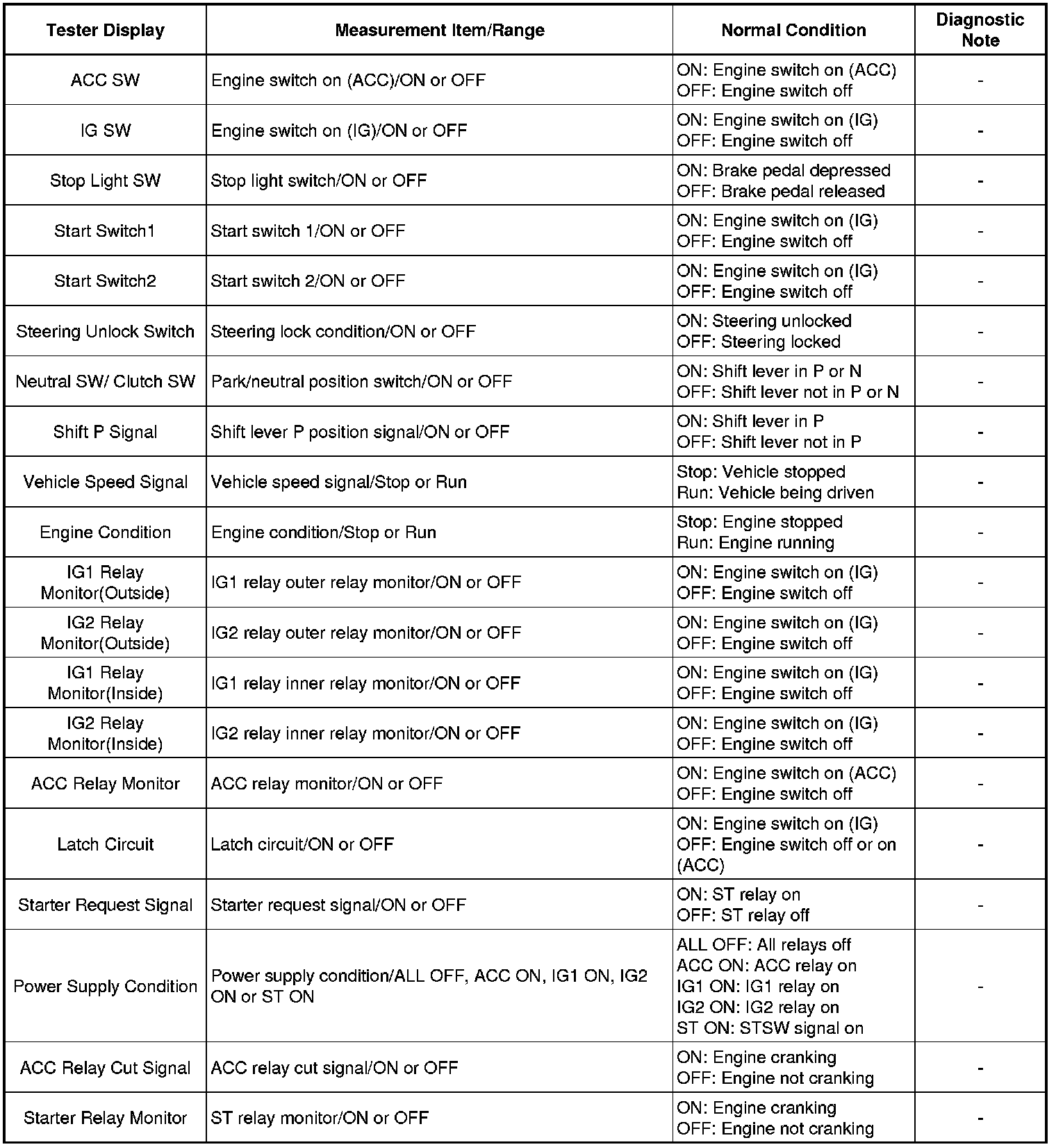 Using the Techstream to read the Data List allows the values or states of switches, sensors, actuators and other items to be read without removing any parts. This non-intrusive inspection can be very useful because intermittent conditions or signals may be discovered before parts or wiring is disturbed. Reading the Data List information early in troubleshooting is one way to save diagnostic time.