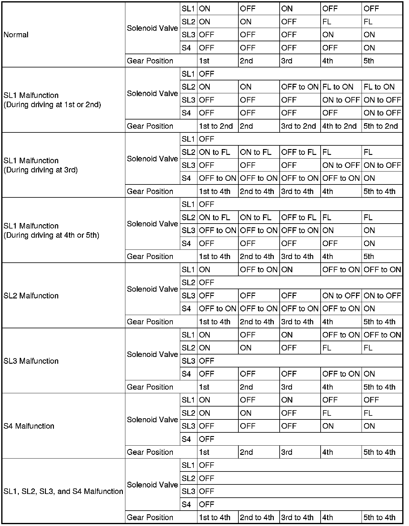 If any of the shift solenoid valve circuits develops an open or short, the ECM turns the other shift solenoid "ON" and "OFF" in order to shift into the gear positions shown in the table below.
