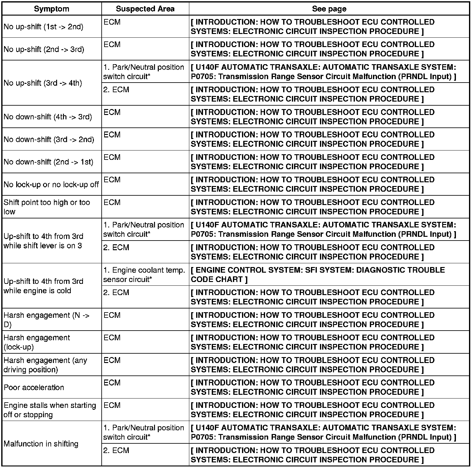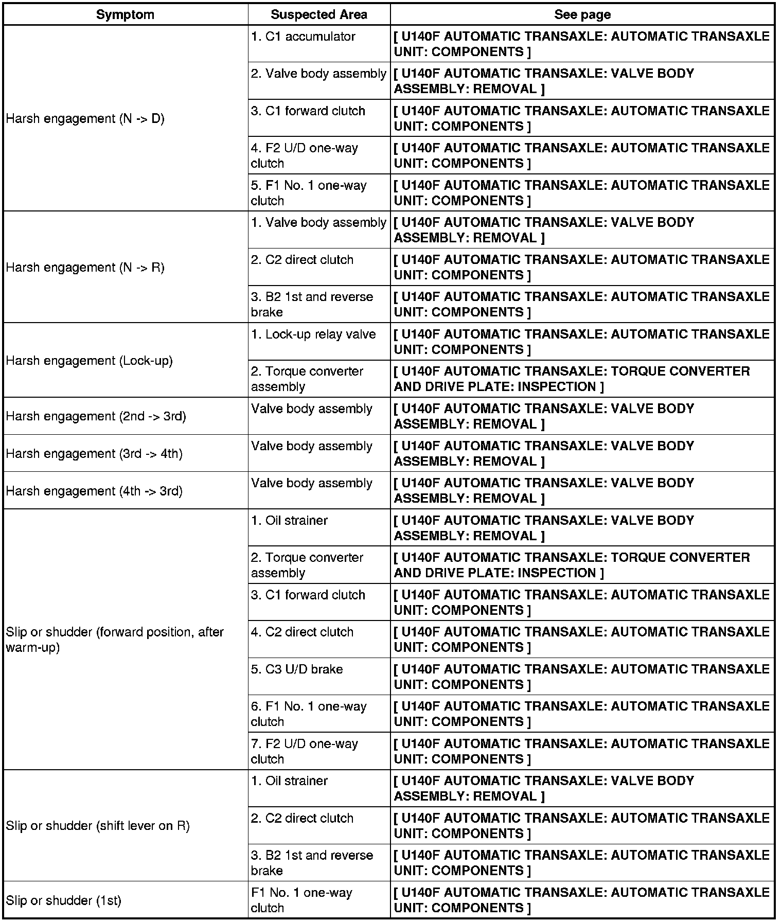 U140F AUTOMATIC TRANSAXLE: AUTOMATIC TRANSAXLE SYSTEM: PROBLEM SYMPTOMS TABLE