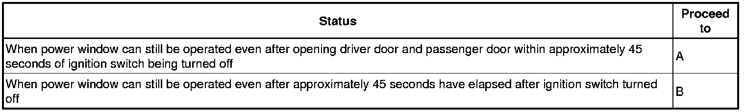 * When the driver door has not been opened and fully closed, each door power window regulator motor can control its power window operation for approximately 45 seconds after the ignition switch is turned from ON to OFF (the key is removed) by receiving operation permission signals from the main body ECU. However, when approximately 45 seconds have elapsed, or the driver door or front passenger side door is opened within approximately 45 seconds of the ignition switch being turned OFF (the key is removed), the power window regulator motor stops operating.