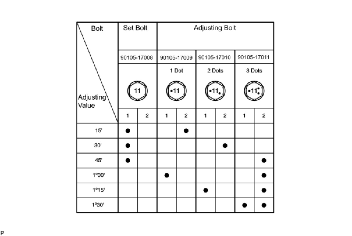 If the camber is not within the specification, estimate how much additional camber adjustment will be required and select the camber adjusting bolt using the following table.