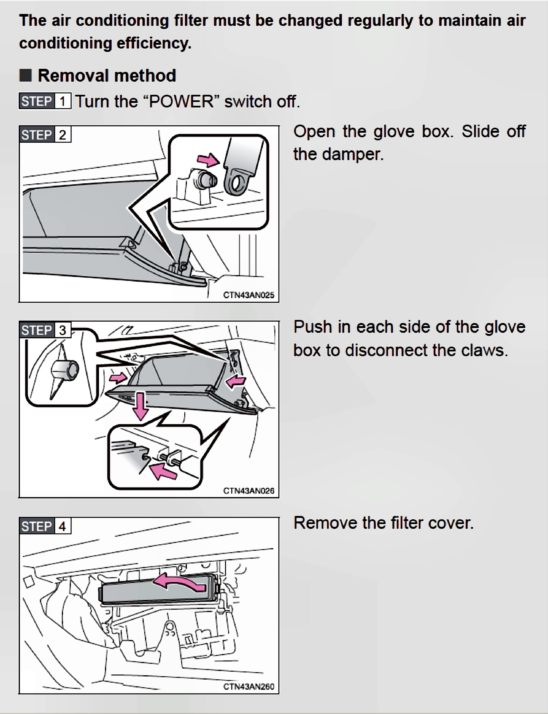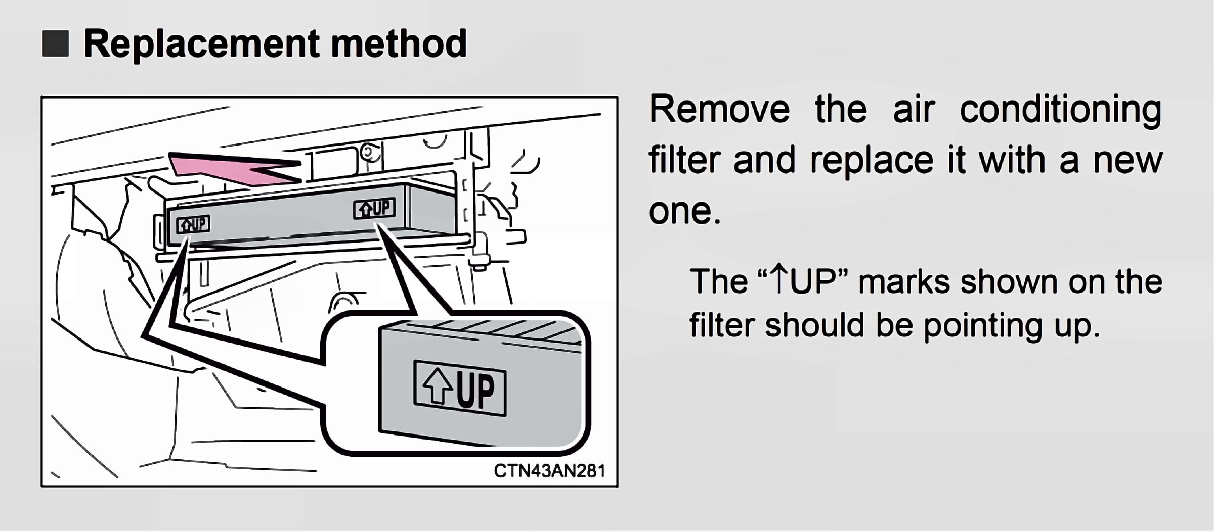 - Inspect and replace the air conditioning filter according to the maintenance schedule. In dusty areas or areas with heavy traffic flow, early replacement may be required. (For scheduled maintenance information, please refer to the "Scheduled Maintenance Guide" or "Owner's Manual Supplement".)