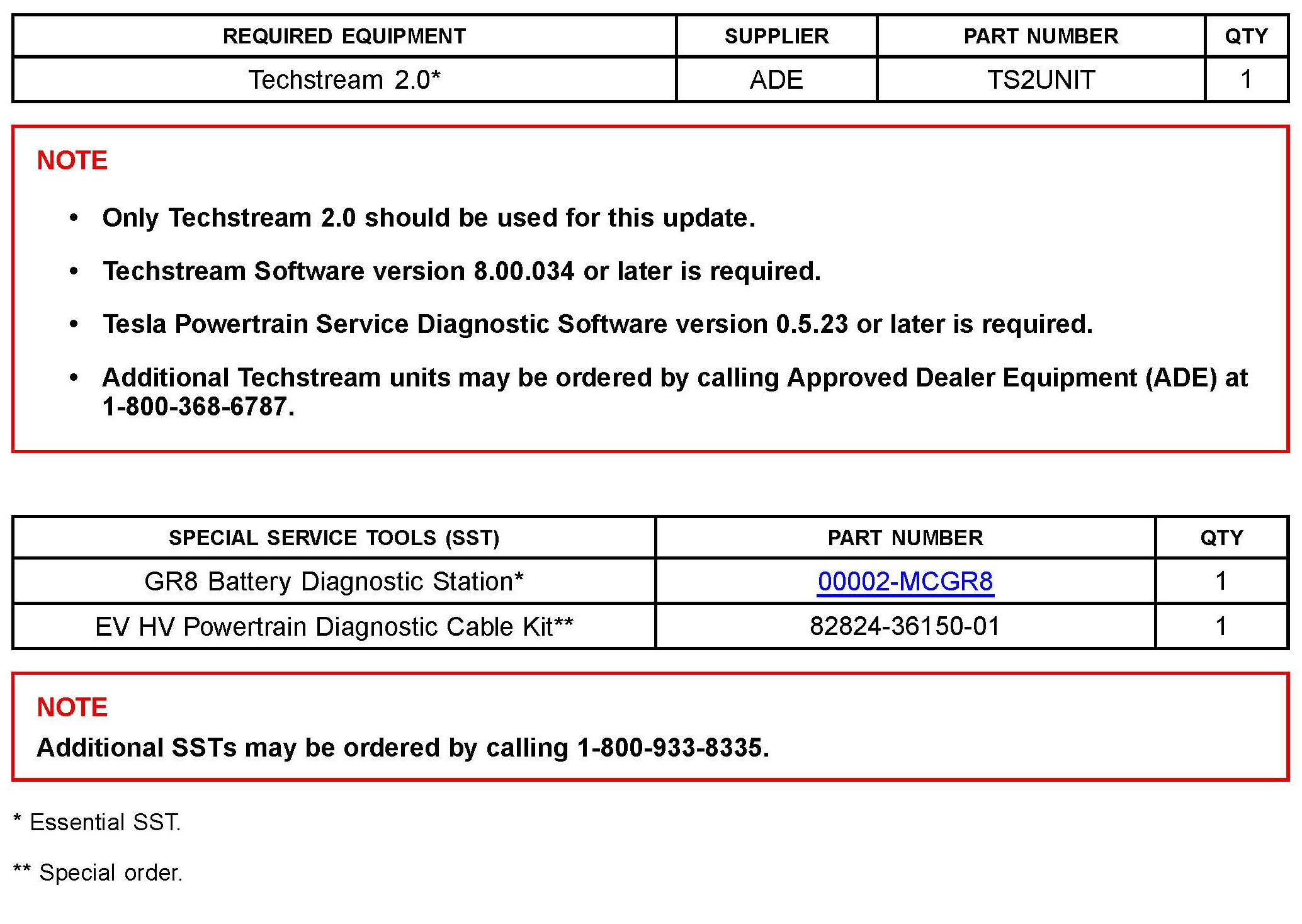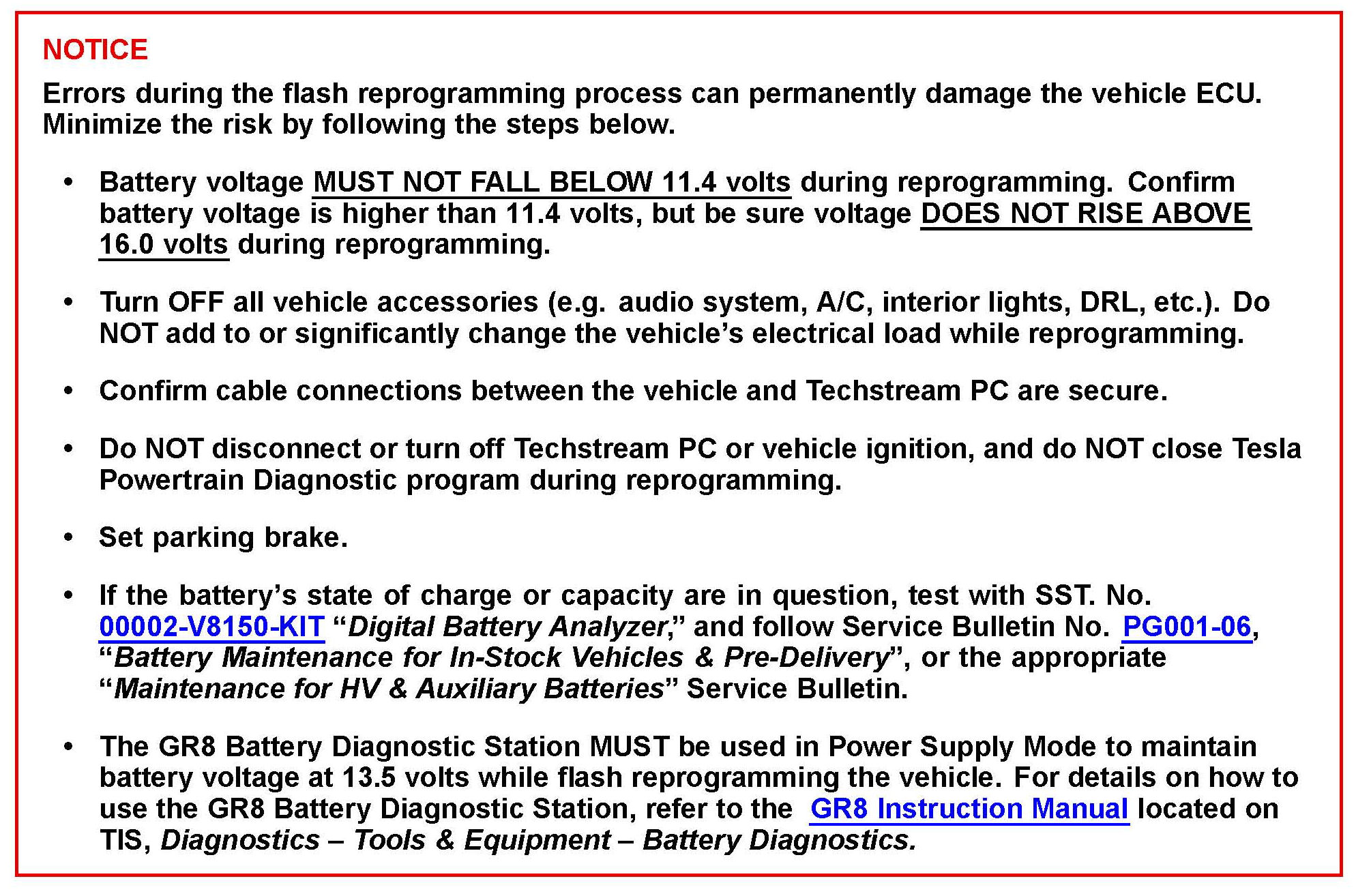 Flash reprogramming allows the ECU software to be updated without replacing the ECU. Flash calibration updates for the RAV4 EV are released as field-fix procedures described in individual Service Bulletins. This bulletin details the ECU flash reprogramming process and outlines use of the Techstream Health Check Function and the Tesla Powertrain Service Diagnostics program.